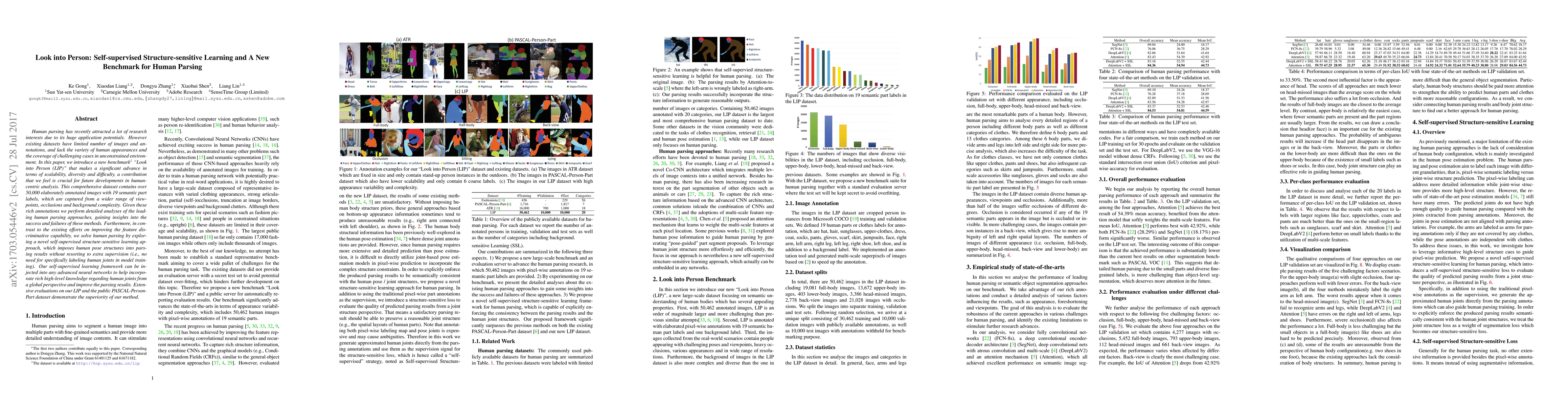 This paper introduces the "Look into Person (LIP)" benchmark, a comprehensive dataset with over 50,000 annotated images featuring 19 semantic part labels, aimed at addressing the limitations of existing human parsing datasets. The authors propose a self-supervised structure-sensitive learning approach to improve human parsing without relying on additional annotations, demonstrating its effectiveness through extensive evaluations.