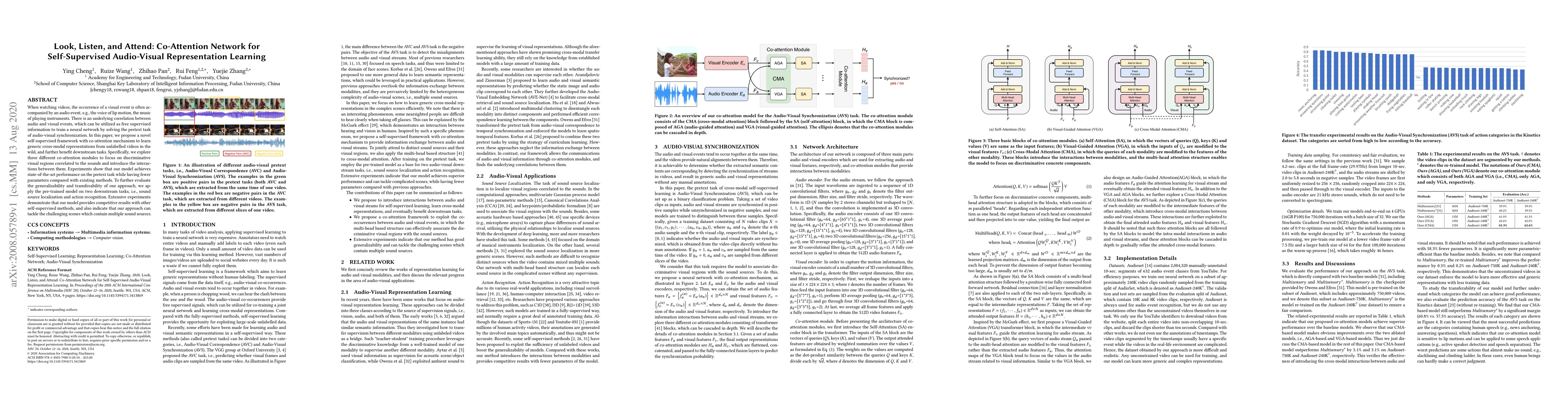 This paper proposes a self-supervised co-attention network for learning audio-visual representations from unlabeled videos, leveraging the correlation between visual and audio events. The model achieves state-of-the-art performance on audio-visual synchronization tasks and demonstrates competitive results on downstream tasks like sound source localization and action recognition.