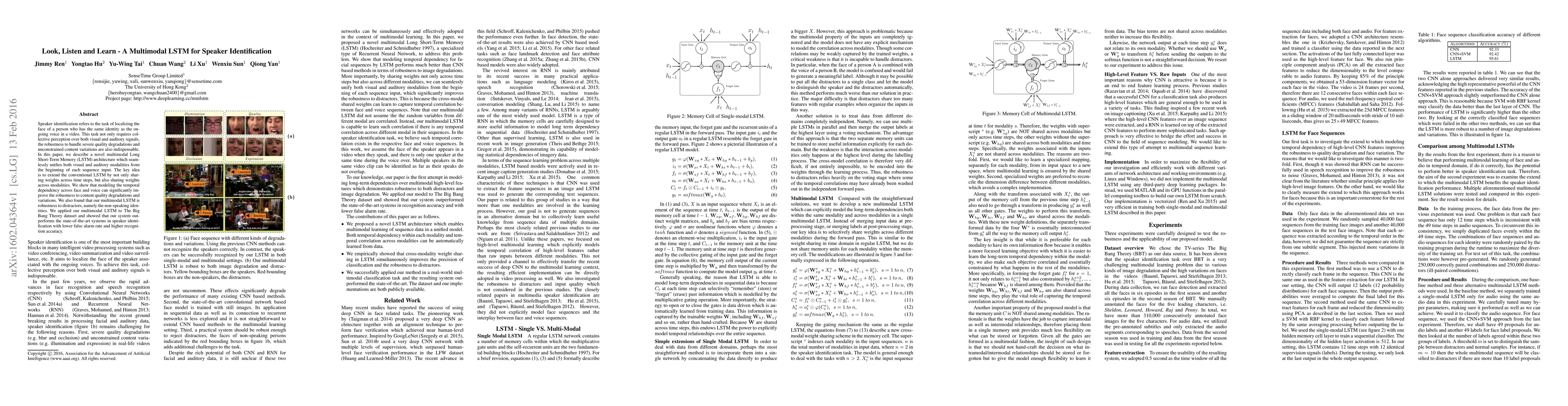 Speaker identification refers to the task of localizing the face of a person who has the same identity as the ongoing voice in a video. This task not only requires collective perception over both visual and auditory signals, the robustness to handle severe quality degradations and unconstrained content variations are also indispensable. In this paper, we describe a novel multimodal Long Short-Term Memory (LSTM) architecture which seamlessly unifies both visual and auditory modalities from the beginning of each sequence input. The key idea is to extend the conventional LSTM by not only sharing weights across time steps, but also sharing weights across modalities. We show that modeling the temporal dependency across face and voice can significantly improve the robustness to content quality degradations and variations. We also found that our multimodal LSTM is robustness to distractors, namely the non-speaking identities. We applied our multimodal LSTM to The Big Bang Theory dataset and showed that our system outperforms the state-of-the-art systems in speaker identification with lower false alarm rate and higher recognition accuracy.