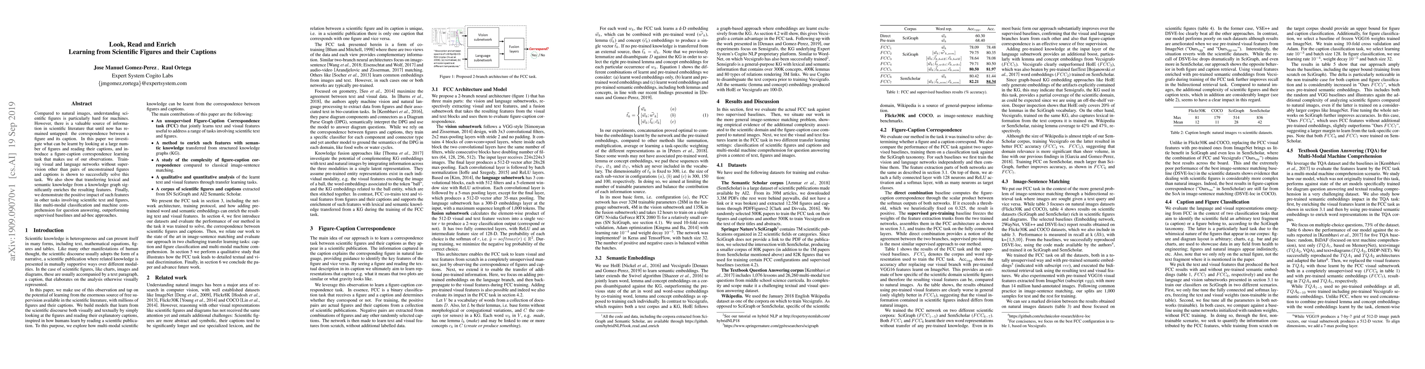 Compared to natural images, understanding scientific figures is particularly hard for machines. However, there is a valuable source of information in scientific literature that until now has remained untapped: the correspondence between a figure and its caption. In this paper we investigate what can be learnt by looking at a large number of figures and reading their captions, and introduce a figure-caption correspondence learning task that makes use of our observations. Training visual and language networks without supervision other than pairs of unconstrained figures and captions is shown to successfully solve this task. We also show that transferring lexical and semantic knowledge from a knowledge graph significantly enriches the resulting features. Finally, we demonstrate the positive impact of such features in other tasks involving scientific text and figures, like multi-modal classification and machine comprehension for question answering, outperforming supervised baselines and ad-hoc approaches.