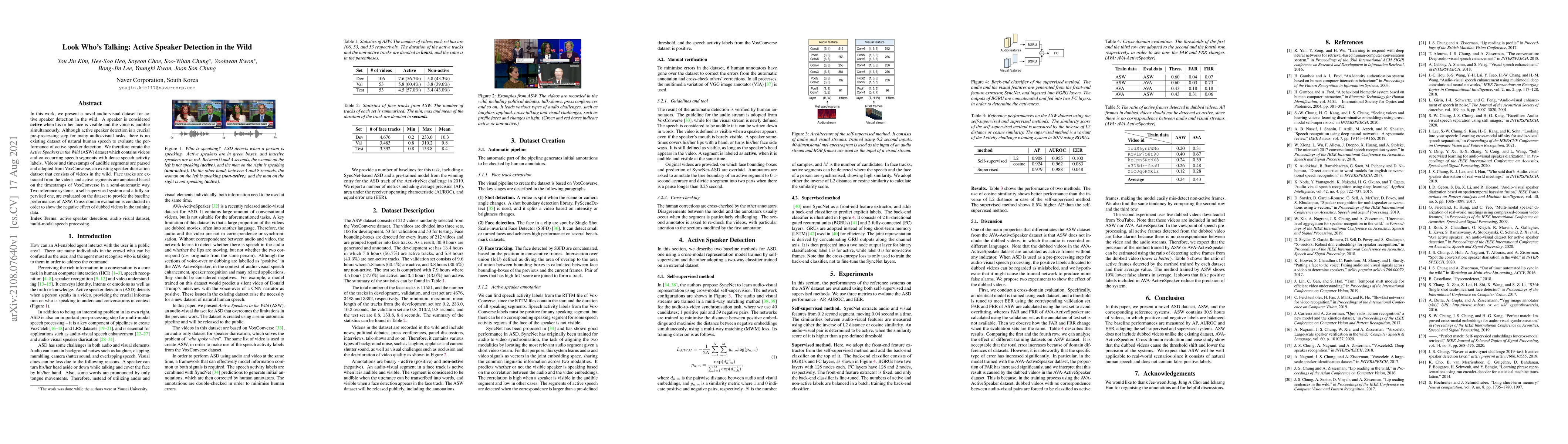 This paper introduces the Active Speakers in the Wild (ASW) dataset for active speaker detection, combining audio-visual data to identify when a speaker's face and voice are both visible and audible. Baseline performances are evaluated using two systems, highlighting the challenges posed by dubbed videos in training data.