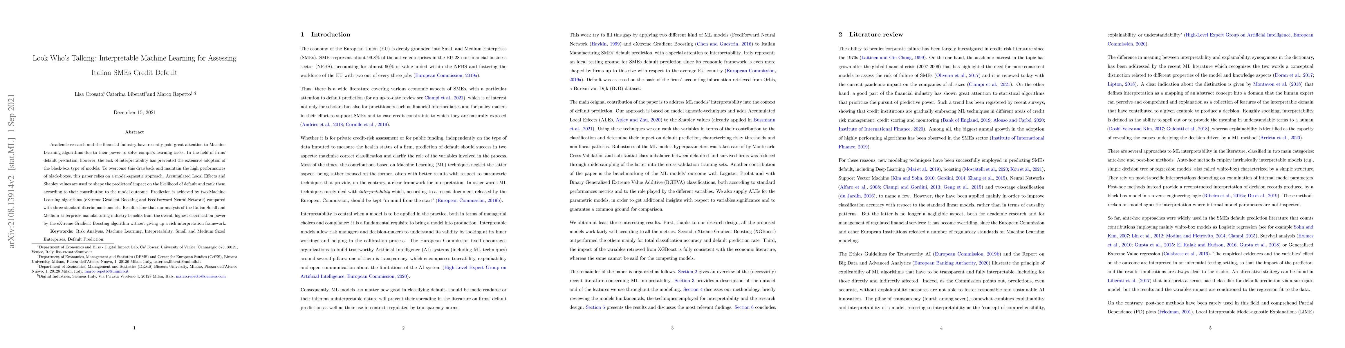 Academic research and the financial industry have recently paid great attention to Machine Learning algorithms due to their power to solve complex learning tasks. In the field of firms' default prediction, however, the lack of interpretability has prevented the extensive adoption of the black-box type of models. To overcome this drawback and maintain the high performances of black-boxes, this paper relies on a model-agnostic approach. Accumulated Local Effects and Shapley values are used to shape the predictors' impact on the likelihood of default and rank them according to their contribution to the model outcome. Prediction is achieved by two Machine Learning algorithms (eXtreme Gradient Boosting and FeedForward Neural Network) compared with three standard discriminant models. Results show that our analysis of the Italian Small and Medium Enterprises manufacturing industry benefits from the overall highest classification power by the eXtreme Gradient Boosting algorithm without giving up a rich interpretation framework.