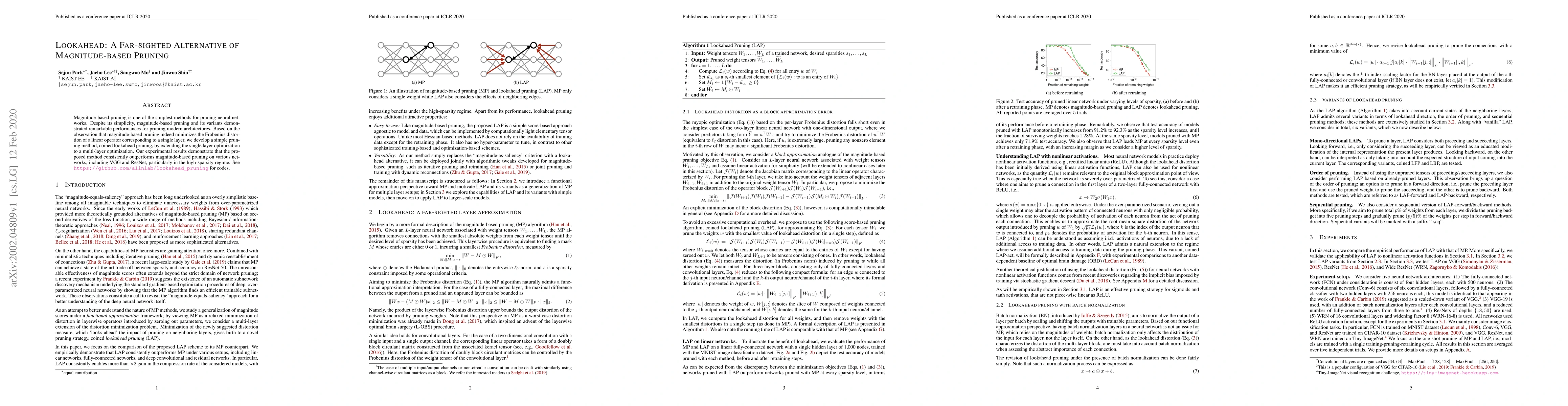 The paper proposes lookahead pruning, a method that extends single-layer optimization to multi-layer optimization for neural network pruning, outperforming traditional magnitude-based pruning, especially at high sparsity levels across various architectures like VGG and ResNet. The method minimizes the Frobenius distortion of linear operators across layers.