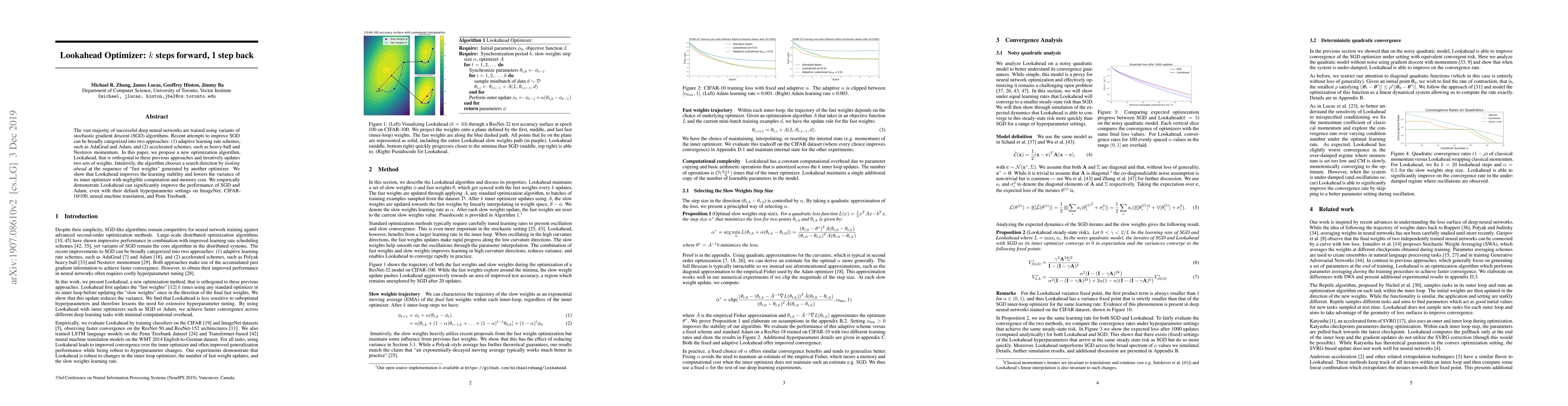 The vast majority of successful deep neural networks are trained using variants of stochastic gradient descent (SGD) algorithms. Recent attempts to improve SGD can be broadly categorized into two approaches: (1) adaptive learning rate schemes, such as AdaGrad and Adam, and (2) accelerated schemes, such as heavy-ball and Nesterov momentum. In this paper, we propose a new optimization algorithm, Lookahead, that is orthogonal to these previous approaches and iteratively updates two sets of weights. Intuitively, the algorithm chooses a search direction by looking ahead at the sequence of fast weights generated by another optimizer. We show that Lookahead improves the learning stability and lowers the variance of its inner optimizer with negligible computation and memory cost. We empirically demonstrate Lookahead can significantly improve the performance of SGD and Adam, even with their default hyperparameter settings on ImageNet, CIFAR-10/100, neural machine translation, and Penn Treebank.