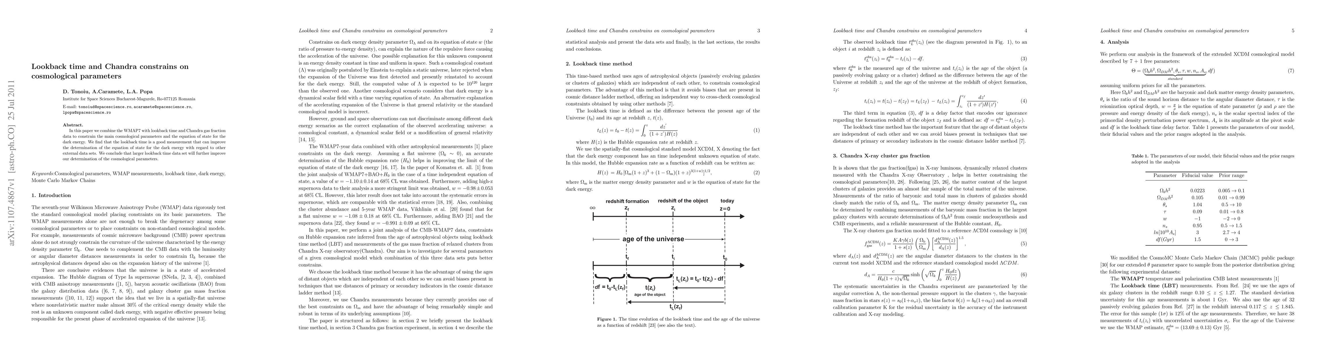 This paper combines WMAP7 data with lookback time and Chandra gas fraction data to refine cosmological parameters, finding that lookback time enhances the determination of dark energy's equation of state. The study suggests that expanding the lookback time dataset will further improve cosmological parameter estimates.