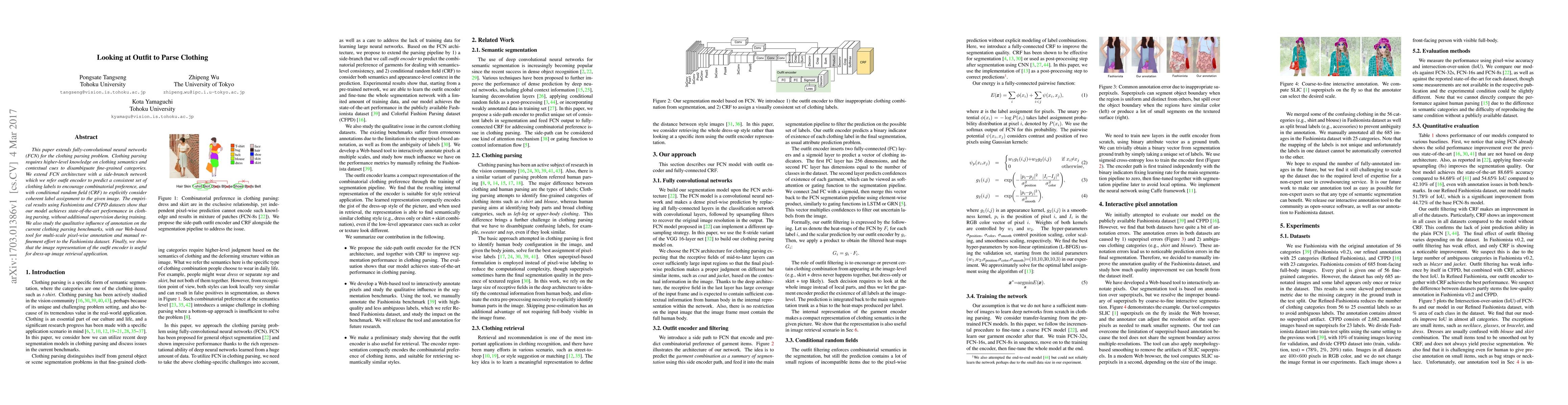 This paper extends fully-convolutional neural networks (FCN) for the clothing parsing problem. Clothing parsing requires higher-level knowledge on clothing semantics and contextual cues to disambiguate fine-grained categories. We extend FCN architecture with a side-branch network which we refer outfit encoder to predict a consistent set of clothing labels to encourage combinatorial preference, and with conditional random field (CRF) to explicitly consider coherent label assignment to the given image. The empirical results using Fashionista and CFPD datasets show that our model achieves state-of-the-art performance in clothing parsing, without additional supervision during training. We also study the qualitative influence of annotation on the current clothing parsing benchmarks, with our Web-based tool for multi-scale pixel-wise annotation and manual refinement effort to the Fashionista dataset. Finally, we show that the image representation of the outfit encoder is useful for dress-up image retrieval application.