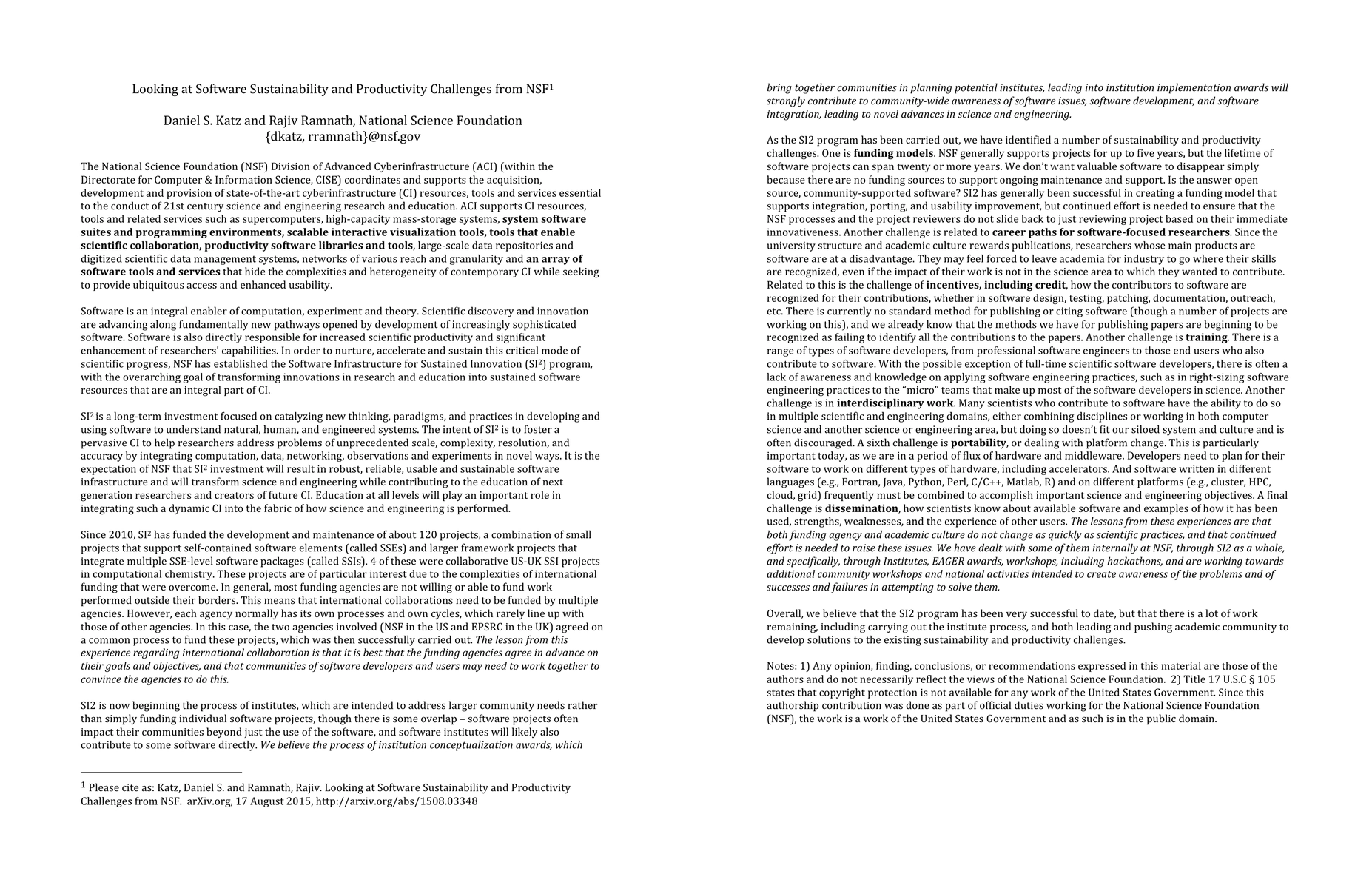 This paper is a contribution to the Computational Science & Engineering Software Sustainability and Productivity Challenges (CSESSP Challenges) Workshop (https://www.nitrd.gov/csessp/), sponsored by the Networking and Information Technology Research and Development (NITRD) Software Design and Productivity (SDP) Coordinating Group, held October 15th-16th 2015 in Washington DC, USA. It introduces the role of software at the National Science Foundation (NSF) and the NSF Software Infrastructure for Sustained Innovation (SI2) program, then describes challenges that the SI2 program has identified, including funding models, career paths, incentives, training, interdisciplinary work, portability, and dissemination, as well as lesson that have been learned.