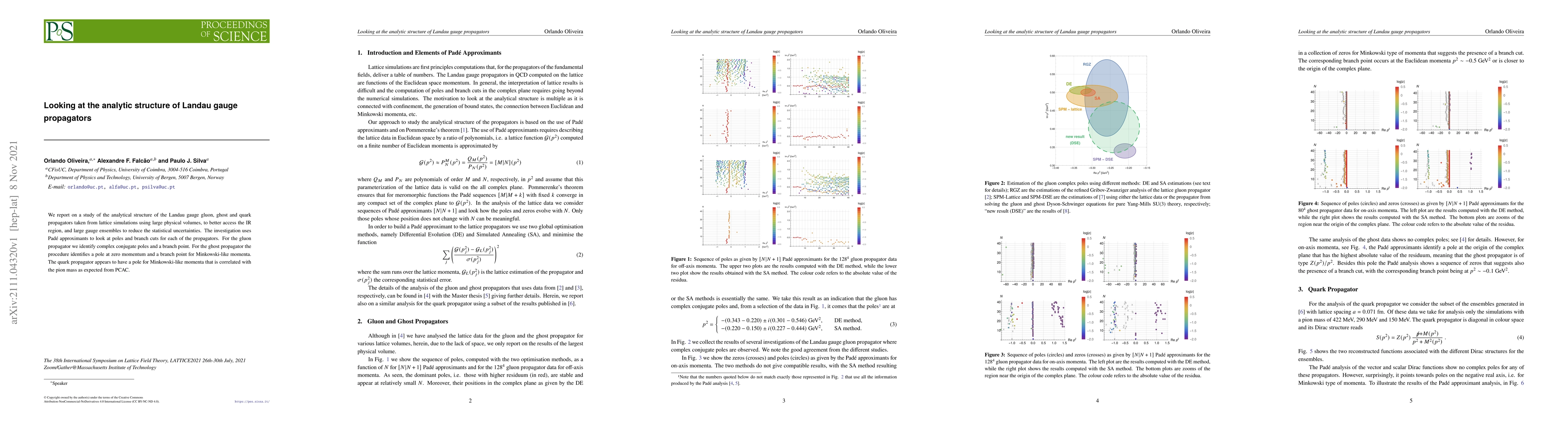 This study investigates the analytical structure of Landau gauge gluon, ghost, and quark propagators from lattice simulations, utilizing Padé approximants to identify poles and branch cuts. The gluon propagator shows complex conjugate poles and a branch point, the ghost propagator has a zero-momentum pole and a Minkowski-like momentum branch point, and the quark propagator exhibits a correlated pole linked to pion mass.