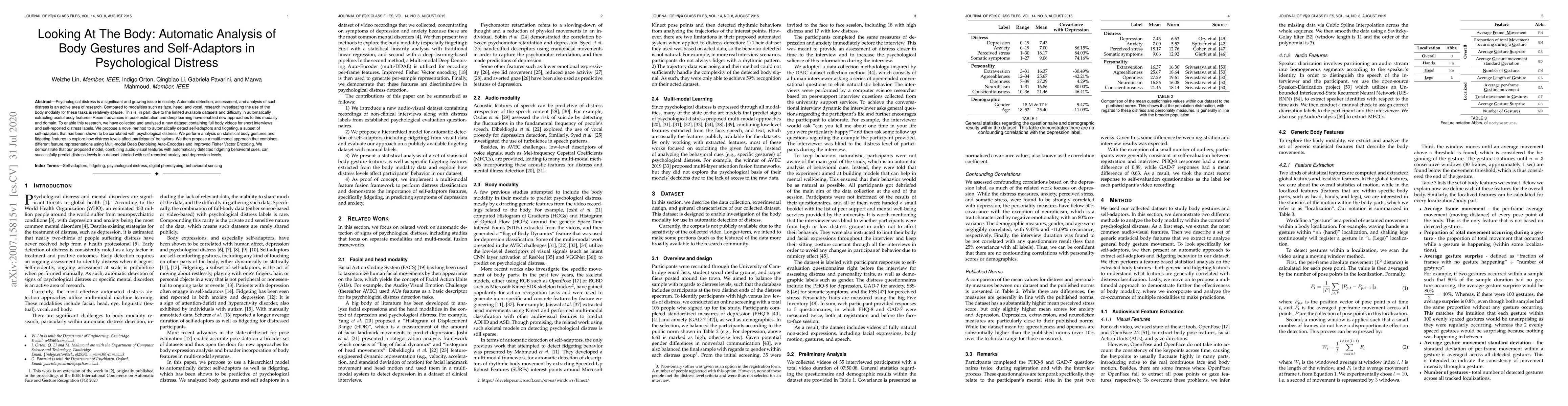 This paper introduces a new dataset for analyzing body gestures and self-adaptors in psychological distress, proposing a method to detect these behaviors and demonstrating their correlation with distress levels. The study combines audio-visual features with detected fidgeting cues using a multi-modal deep learning approach to predict distress levels effectively.