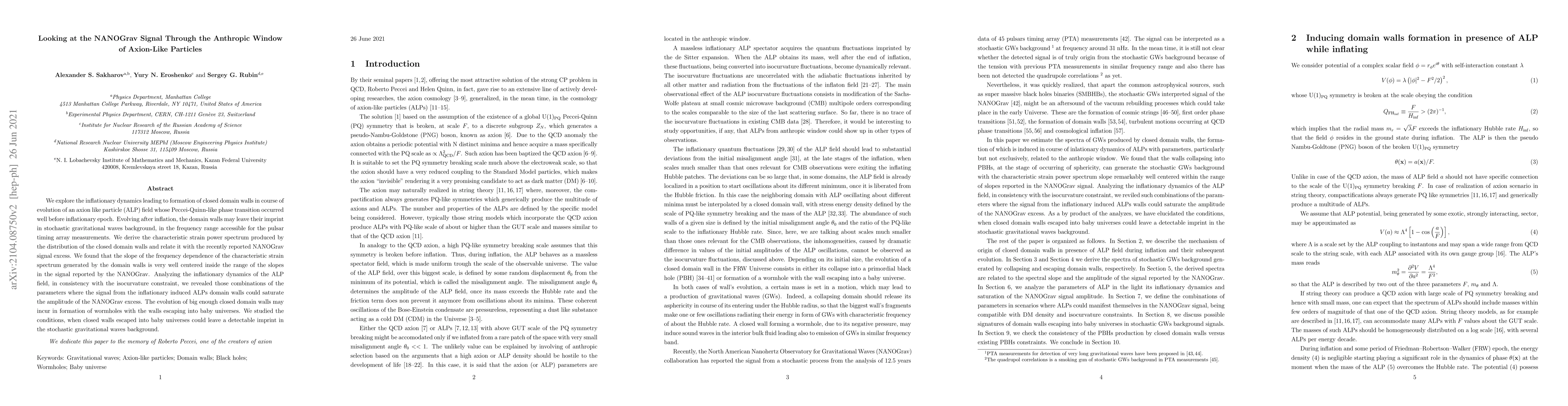 This paper investigates the potential link between axion-like particles (ALPs) and the NANOGrav signal, suggesting that closed domain walls formed by an ALP field's phase transition before inflation could generate a gravitational wave background matching the NANOGrav excess. It also explores the possibility of these domain walls forming wormholes that escape into baby universes, potentially leaving a detectable imprint.