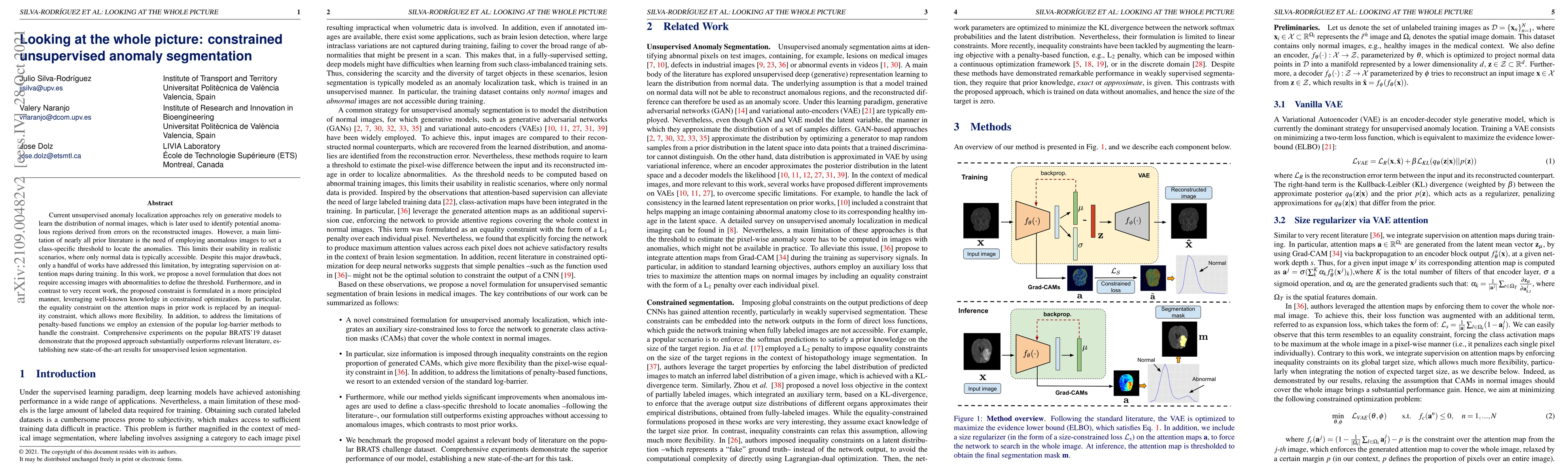 The paper introduces a novel constrained formulation for unsupervised brain lesion segmentation using VAEs and Grad-CAMs, employing inequality constraints and log-barrier methods to avoid the need for anomalous images to set thresholds.