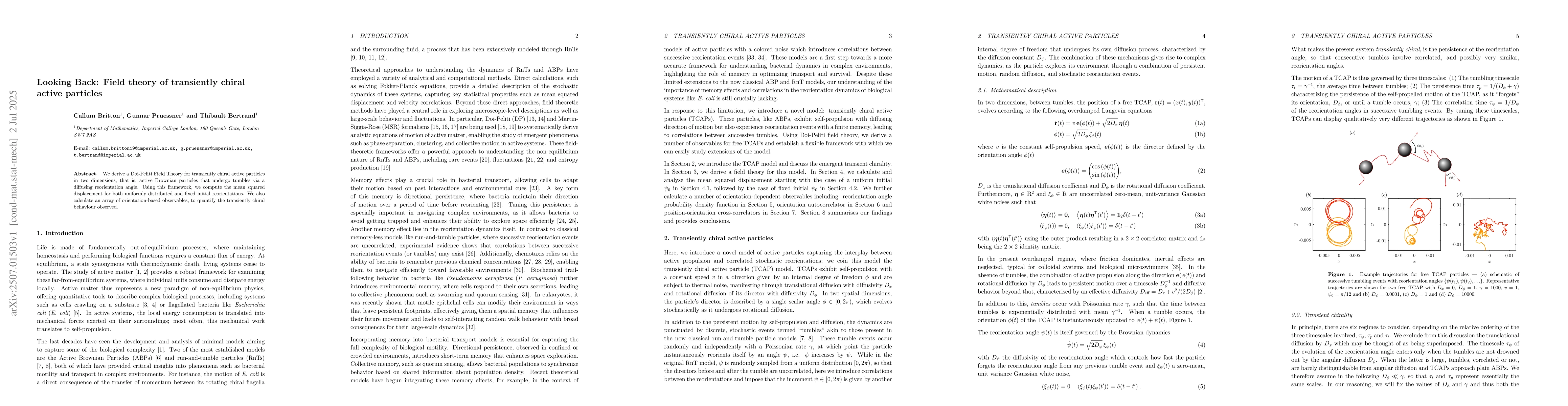 We derive a Doi-Peliti Field Theory for transiently chiral active particles in two dimensions, that is, active Brownian particles that undergo tumbles via a diffusing reorientation angle. Using this framework, we compute the mean squared displacement for both uniformly distributed and fixed initial reorientations. We also calculate an array of orientation-based observables, to quantify the transiently chiral behaviour observed.