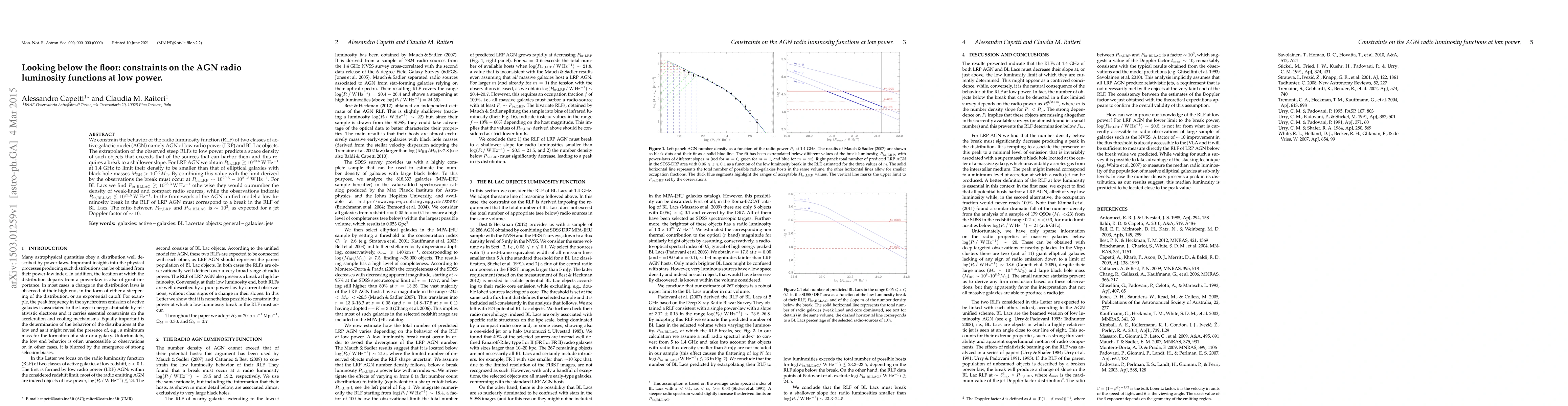 We constrain the behavior of the radio luminosity function (RLF) of two classes of active galactic nuclei (AGN) namely AGN of low radio power (LRP) and BL Lac objects. The extrapolation of the observed steep RLFs to low power predicts a space density of such objects that exceeds that of the sources that can harbor them and this requires a break to a shallower slope. For LRP AGN we obtain P_br,LRP > 10^20.5 W/Hz at 1.4 GHz to limit their density to be smaller than that of elliptical galaxies with black hole masses M_BH > 10^7.5 solar masses. By combining this value with the limit derived by the observations the break must occur at P_br,LRP~10^20.5-10^21.5 W/Hz. For BL Lacs we find P_br,BLLAC > 10^23.3 W/Hz otherwise they would outnumber the density of weak-lined and compact radio sources, while the observations indicate P_br,BLLAC < 10^24.5 W/Hz. In the framework of the AGN unified model a low luminosity break in the RLF of LRP AGN must correspond to a break in the RLF of BL Lacs. The ratio between P_br,LRP and P_br,BLLAC is ~10^3, as expected for a jet Doppler factor of ~10.