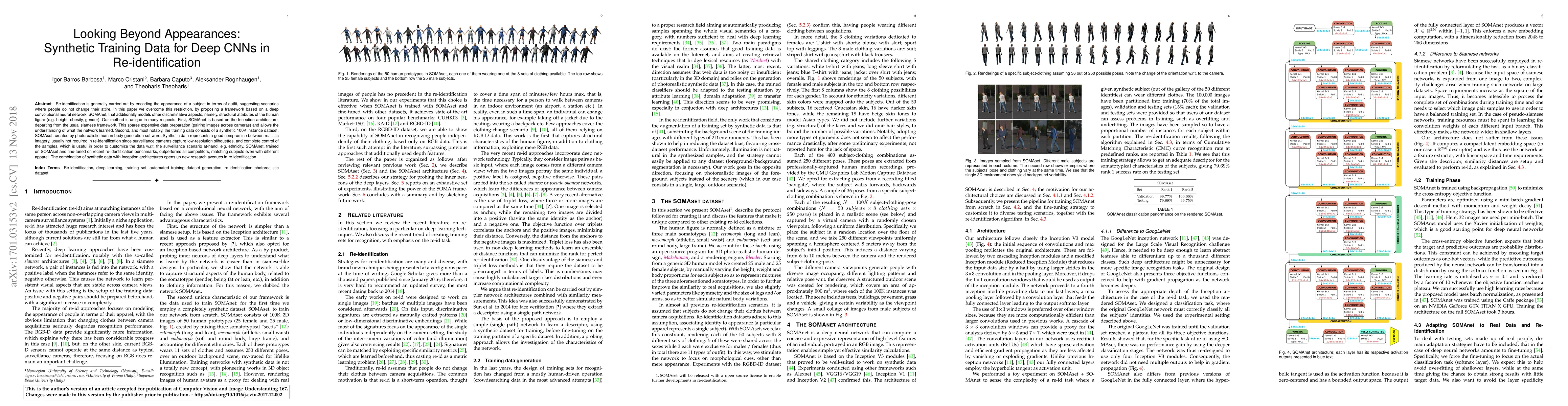 This paper proposes SOMAnet, a deep convolutional neural network based on the Inception architecture for re-identification, which models structural attributes beyond appearance. It leverages synthetic training data, SOMAset, to overcome limitations of appearance-based methods, achieving superior performance in matching subjects with different attire.