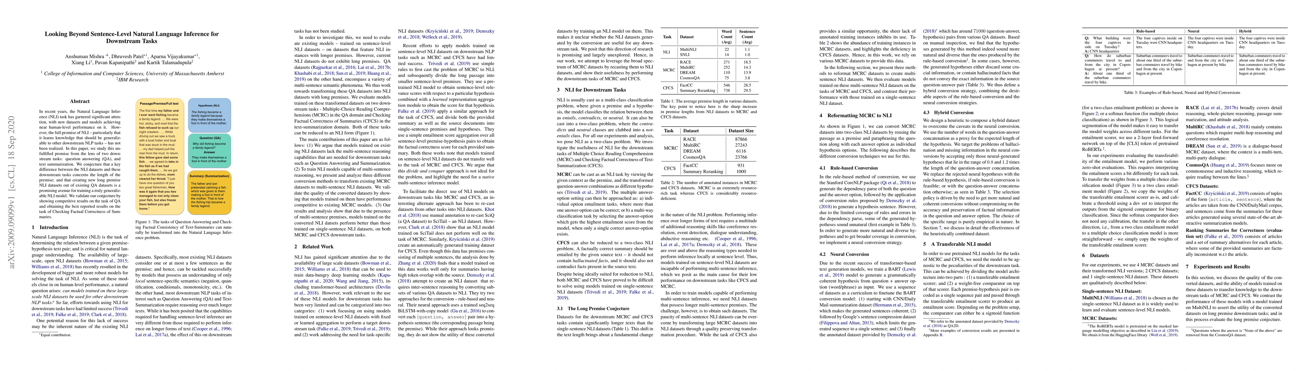 In recent years, the Natural Language Inference (NLI) task has garnered significant attention, with new datasets and models achieving near human-level performance on it. However, the full promise of NLI -- particularly that it learns knowledge that should be generalizable to other downstream NLP tasks -- has not been realized. In this paper, we study this unfulfilled promise from the lens of two downstream tasks: question answering (QA), and text summarization. We conjecture that a key difference between the NLI datasets and these downstream tasks concerns the length of the premise; and that creating new long premise NLI datasets out of existing QA datasets is a promising avenue for training a truly generalizable NLI model. We validate our conjecture by showing competitive results on the task of QA and obtaining the best reported results on the task of Checking Factual Correctness of Summaries.