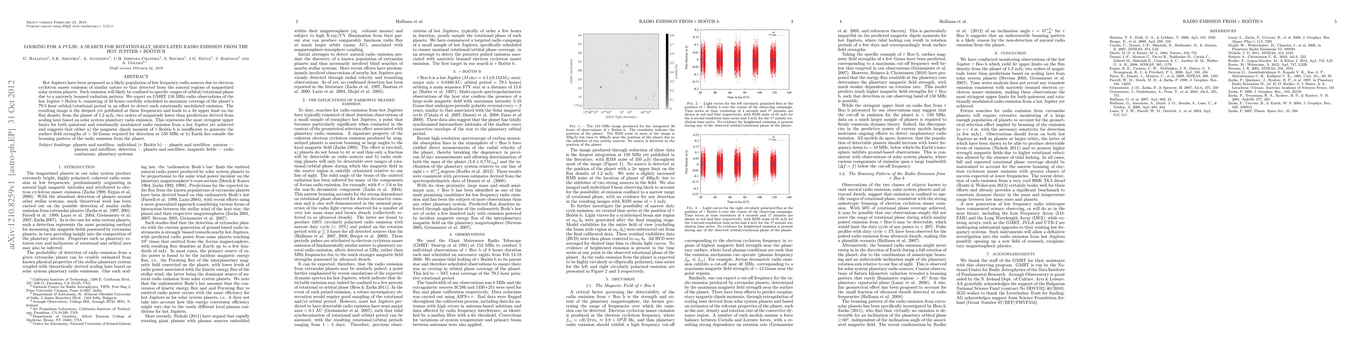 This paper reports on GMRT radio observations of the hot Jupiter Tau Bootis b, aiming to detect rotationally modulated radio emission. The observations, spanning 40 hours, resulted in the deepest image at 150 MHz, leading to a 3-sigma upper limit of 1.2 mJy, significantly lower than predicted. This suggests either a weak magnetic field or that Earth lies outside the beaming pattern of the planet's radio emission.