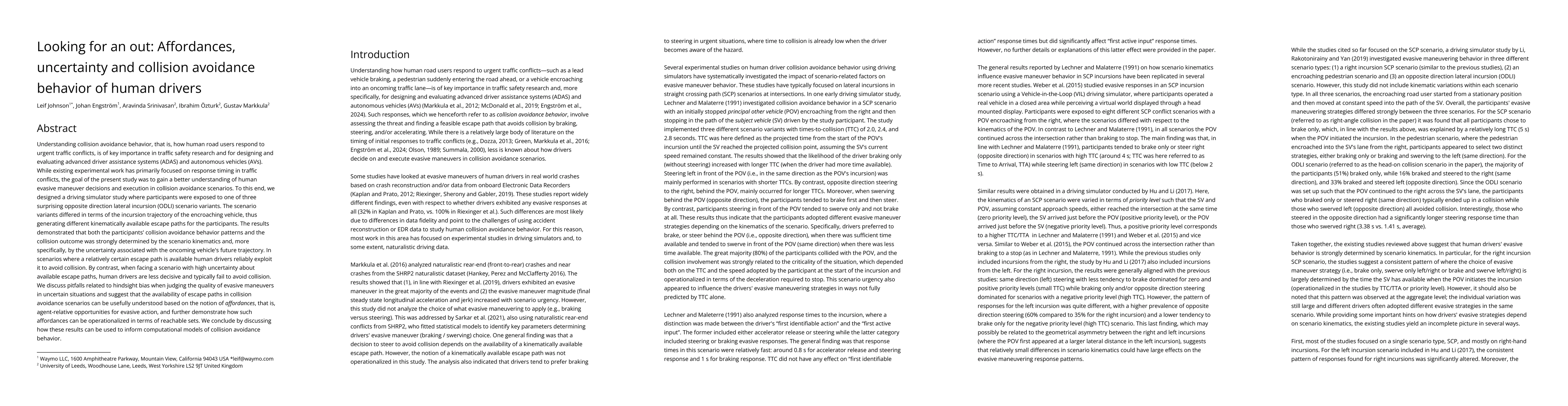The research distinguishes itself by focusing on human evasive maneuver decisions and execution in collision avoidance scenarios, emphasizing the role of uncertainty and affordances, rather than just response timing.