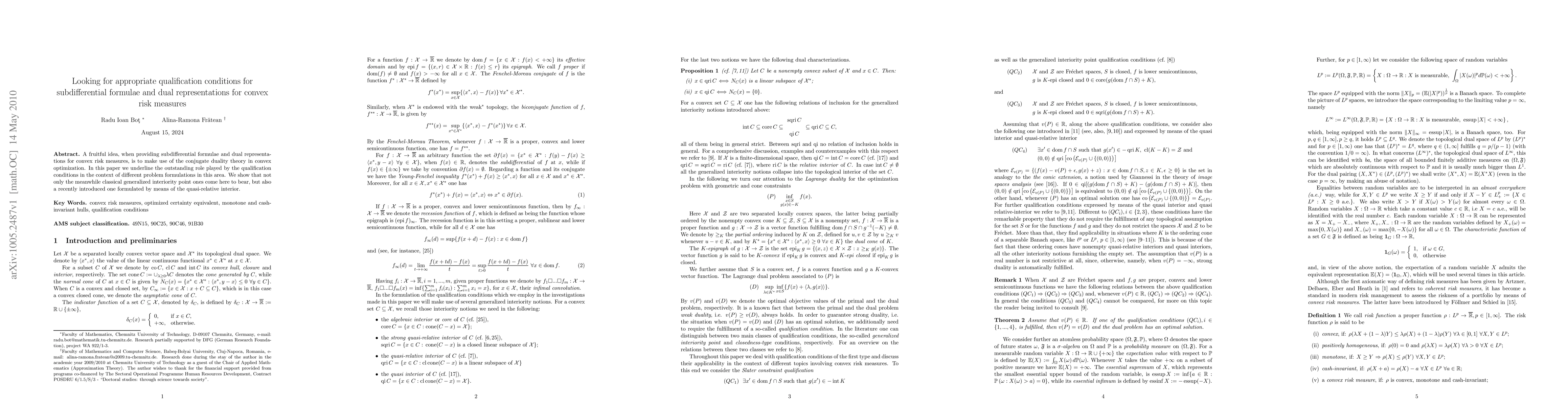 This paper explores qualification conditions essential for deriving subdifferential formulae and dual representations of convex risk measures, emphasizing both the classical generalized interiority points and the newly introduced quasi-relative interior conditions.