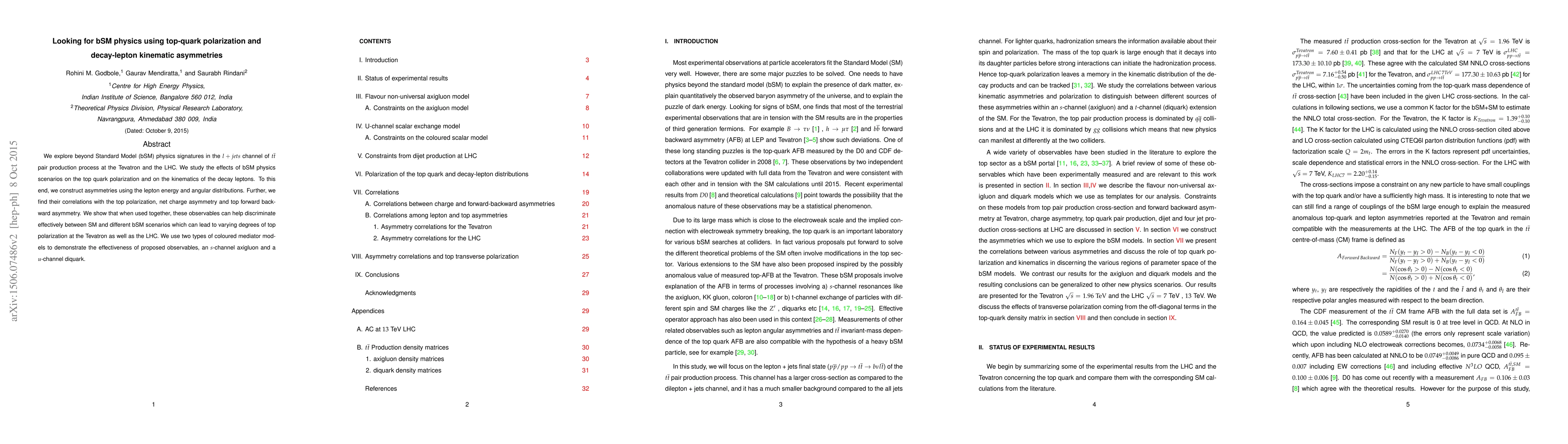 This paper investigates beyond Standard Model (bSM) physics in the $t\overline{t}$ production process using top-quark polarization and decay-lepton kinematic asymmetries at the Tevatron and LHC. It demonstrates that these observables can effectively distinguish between Standard Model and various bSM scenarios, using axigluon and diquark models as examples.
