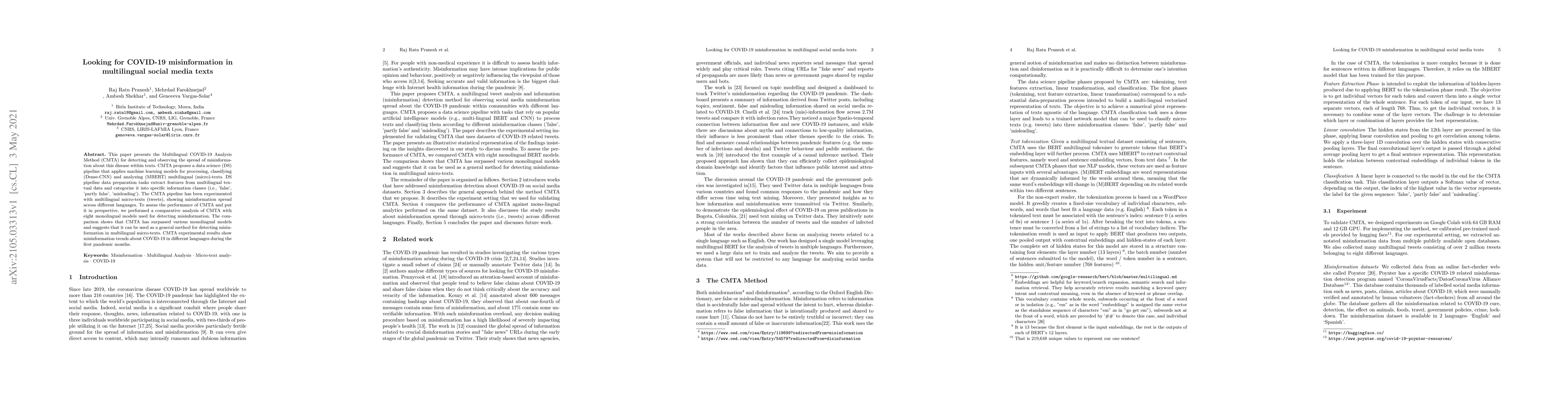 This research introduces the Multilingual COVID-19 Analysis Method (CMTA) for identifying and analyzing misinformation about COVID-19 across multilingual social media texts. The CMTA employs a data science pipeline with machine learning models to classify and analyze multilingual micro-texts, demonstrating superior performance compared to monolingual models in detecting misinformation trends during the early pandemic months.