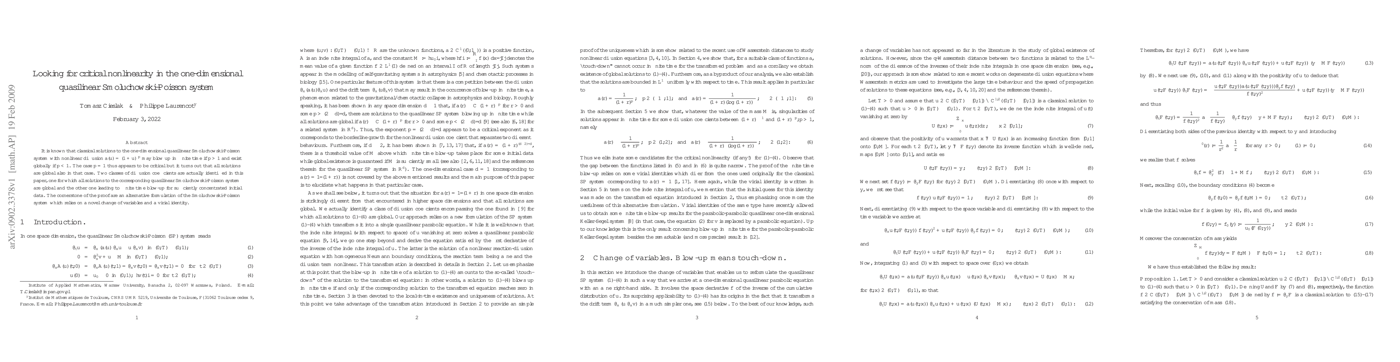 This paper investigates the critical nonlinearity in the one-dimensional quasilinear Smoluchowski-Poisson system, identifying two classes of diffusion coefficients: one resulting in global solutions and the other causing finite time blow-up for concentrated initial data. The proof hinges on a new system formulation and a novel change of variables.