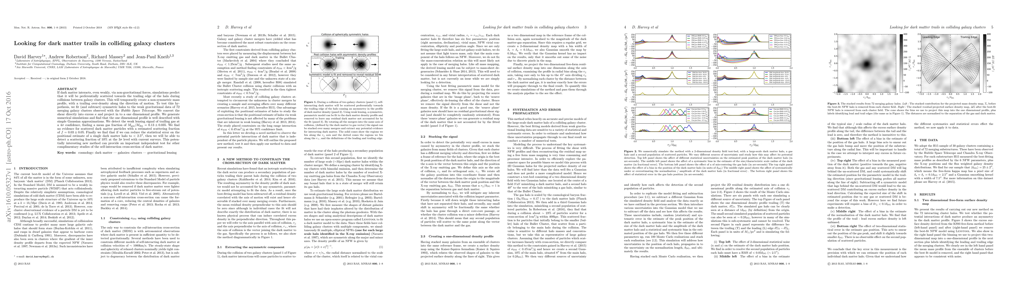 If dark matter interacts, even weakly, via non-gravitational forces, simulations predict that it will be preferentially scattered towards the trailing edge of the halo during collisions between galaxy clusters. This will temporarily create a non-symmetric mass profile, with a trailing over-density along the direction of motion. To test this hypothesis, we fit (and subtract) symmetric halos to the weak gravitational data of 72 merging galaxy clusters observed with the Hubble Space Telescope. We convert the shear directly into excess {\kappa} and project in to a one dimensional profile. We generate numerical simulations and find that the one dimensional profile is well described with simple Gaussian approximations. We detect the weak lensing signal of trailing gas at a 4{\sigma} confidence, finding a mean gas fraction of Mgas/Mdm = 0.13 +/- 0.035. We find no evidence for scattered dark matter particles with a estimated scattering fraction of f = 0.03 +/- 0.05. Finally we find that if we can reduce the statistical error on the positional estimate of a single dark matter halo to <2.5", then we will be able to detect a scattering fraction of 10% at the 3{\sigma} level with current surveys. This poten- tially interesting new method can provide an important independent test for other complimentary studies of the self-interaction cross-section of dark matter.