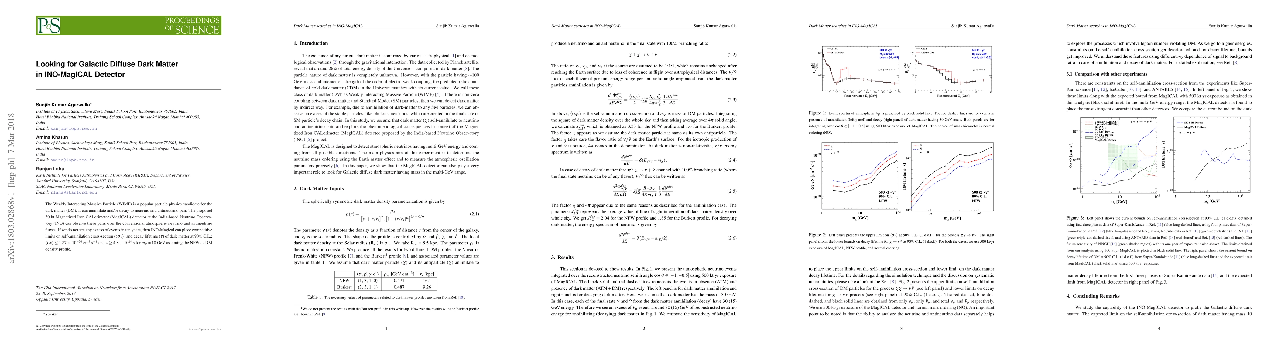 The Weakly Interacting Massive Particle (WIMP) is a popular particle physics candidate for the dark matter (DM). It can annihilate and/or decay to neutrino and antineutrino pair. The proposed 50 kt Magnetized Iron CALorimeter (MagICAL) detector at the India-based Neutrino Observatory (INO) can observe these pairs over the conventional atmospheric neutrino and antineutrino fluxes. If we do not see any excess of events in ten years, then INO-Magical can place competitive limits on self-annihilation cross-section ($\langle\sigma v\rangle$) and decay lifetime ($\tau$) of dark matter at 90\% C.L.: $\langle\sigma v\rangle\leq 1.87\,\times\,10^{-24}$ cm$^3$ s$^{-1}$ and $\tau\geq 4.8\,\times\,10^{24}$ s for $m_\chi$ = 10 GeV assuming the NFW as DM density profile.