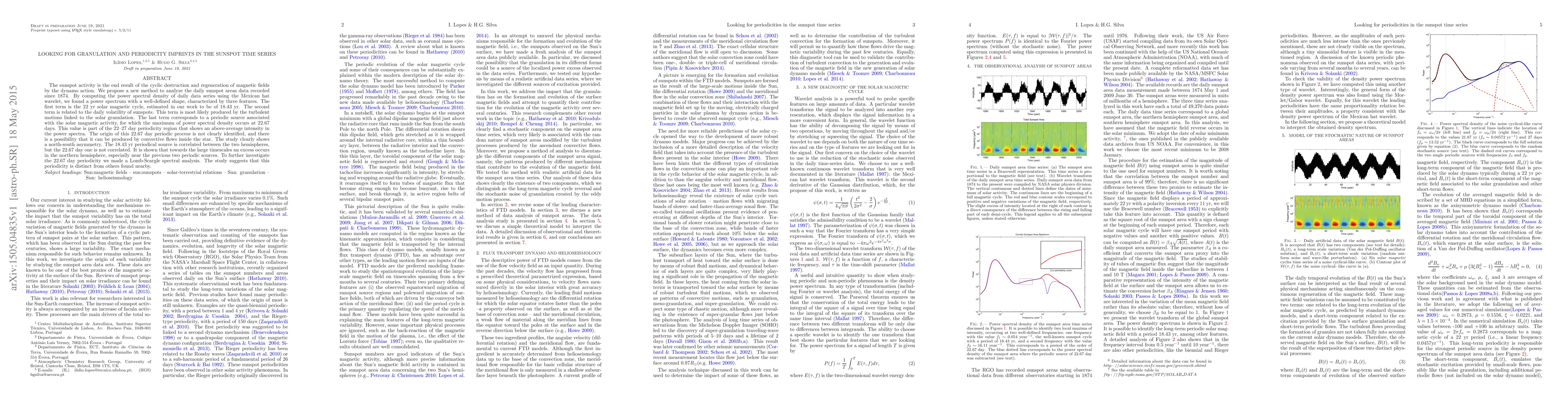 The sunspot activity is the end result of the cyclic destruction and regeneration of magnetic fields by the dynamo action. We propose a new method to analyze the daily sunspot areas data recorded since 1874. By computing the power spectral density of daily data series using the Mexican hat wavelet, we found a power spectrum with a well-defined shape, characterized by three features. The first term is the 22 yr solar magnetic cycle, estimated in our work to be of 18.43 yr. The second term is related to the daily volatility of sunspots. This term is most likely produced by the turbulent motions linked to the solar granulation. The last term corresponds to a periodic source associated with the solar magnetic activity, for which the maximum of power spectral density occurs at 22.67 days. This value is part of the 22-27 day periodicity region that shows an above-average intensity in the power spectra. The origin of this 22.67 day periodic process is not clearly identified, and there is a possibility that it can be produced by convective flows inside the star. The study clearly shows a north-south asymmetry. The 18.43 yr periodical source is correlated between the two hemispheres, but the 22.67 day one is not correlated. It is shown that towards the large timescales an excess occurs in the northern hemisphere, especially near the previous two periodic sources. To further investigate the 22.67 day periodicity we made a Lomb-Scargle spectral analysis. The study suggests that this periodicity is distinct from others found nearby.