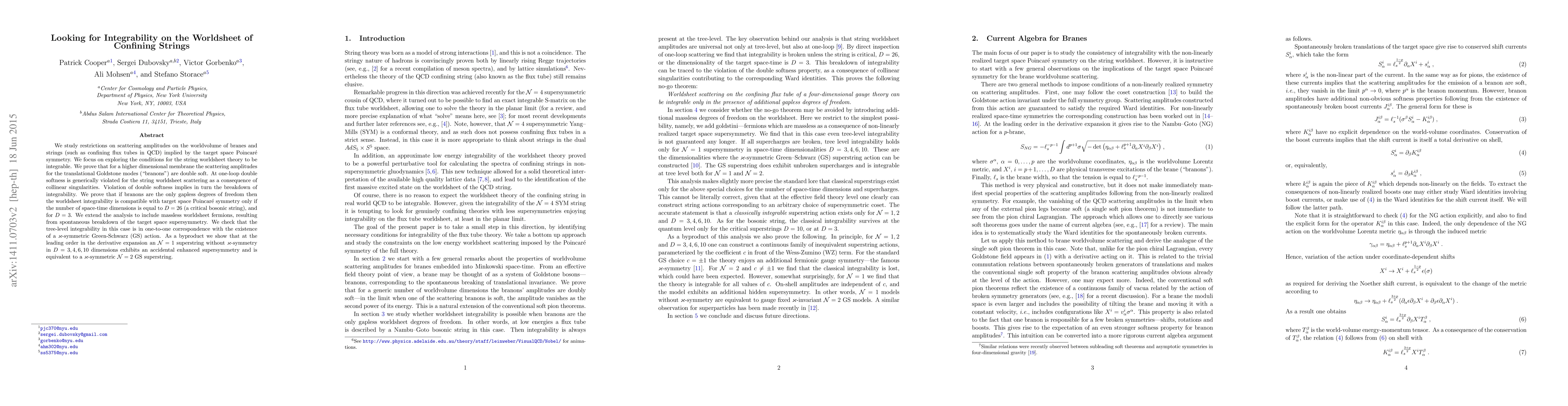 This paper investigates the integrability conditions for the worldsheet theory of confining strings in the context of target space Poincaré symmetry, proving that double softness is violated at one-loop due to collinear singularities, leading to integrability breakdown. It concludes that worldsheet integrability is only compatible with Poincaré symmetry for D = 26 or D = 3 dimensions if branons are the only gapless degrees of freedom.