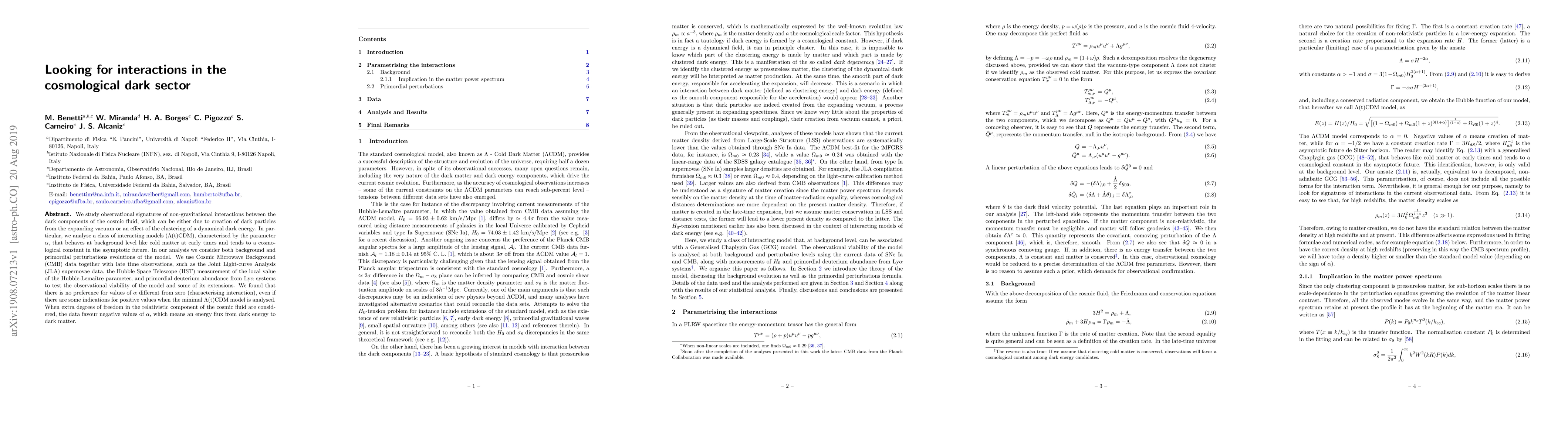 We study observational signatures of non-gravitational interactions between the dark components of the cosmic fluid, which can be either due to creation of dark particles from the expanding vacuum or an effect of the clustering of a dynamical dark energy. In particular, we analyse a class of interacting models ($\Lambda$(t)CDM), characterised by the parameter $\alpha$, that behaves at background level like cold matter at early times and tends to a cosmological constant in the asymptotic future. In our analysis we consider both background and primordial perturbations evolutions of the model. We use Cosmic Microwave Background (CMB) data together with late time observations, such as the Joint Light-curve Analysis (JLA) supernovae data, the Hubble Space Telescope (HST) measurement of the local value of the Hubble-Lema\^itre parameter, and primordial deuterium abundance from Ly$\alpha$ systems to test the observational viability of the model and some of its extensions. We found that there is no preference for values of $\alpha$ different from zero (characterising interaction), even if there are some indications for positive values when the minimal $\Lambda$(t)CDM model is analysed. When extra degrees of freedom in the relativistic component of the cosmic fluid are considered, the data favour negative values of $\alpha$, which means an energy flux from dark energy to dark matter.