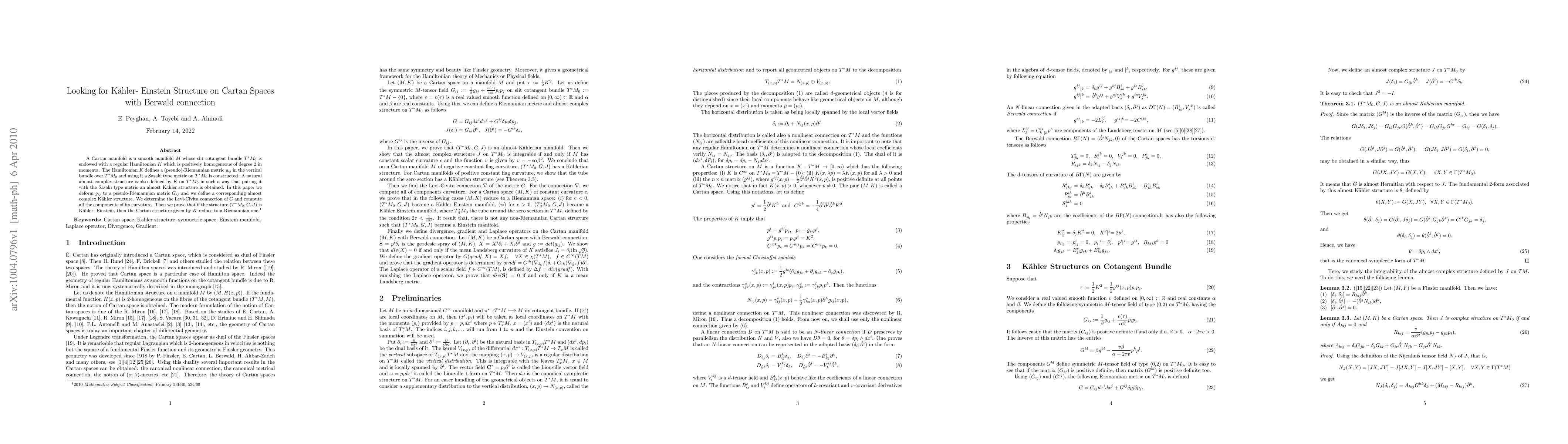 Research paper explores a Cartan space with Berwald connection, finding that if it's K"ahler-Einstein, the structure reduces to a Riemannian one, enabling a more simplified understanding of its properties.