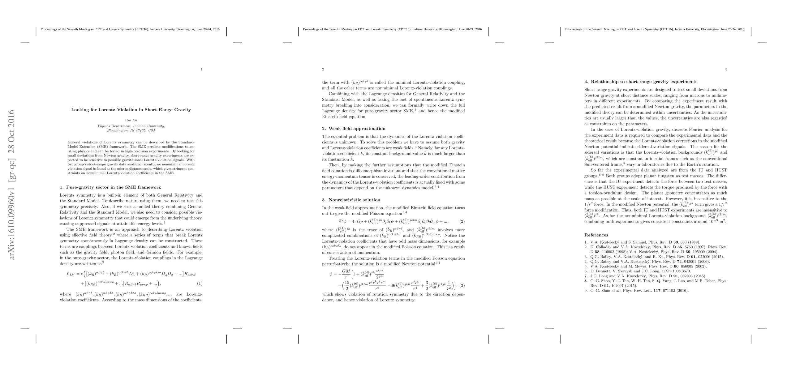 This work is novel as it explores the possibility of gravitational Lorentz-violation and its implications on short-range gravity experiments.
