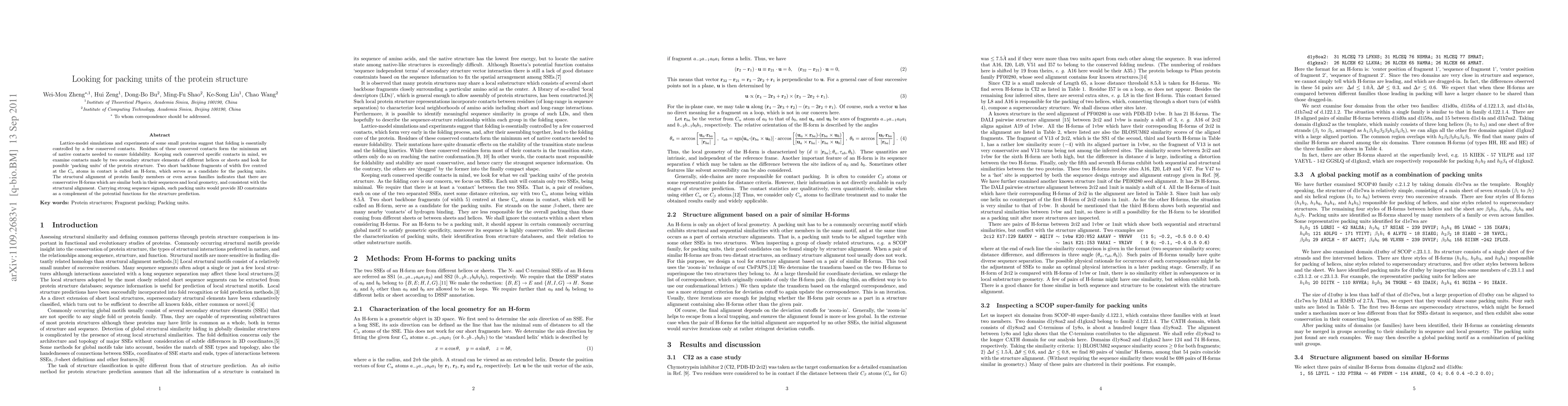 Lattice-model simulations and experiments of some small proteins suggest that folding is essentially controlled by a few conserved contacts. Residues of these conserved contacts form the minimum set of native contacts needed to ensure foldability. Keeping such conserved specific contacts in mind, we examine contacts made by two secondary structure elements of different helices or sheets and look for possible 'packing units' of the protein structure. Two short backbone fragments of width five centred at the C? atoms in contact is called an H-form, which serves as a candidate for the packing units. The structural alignment of protein family members or even across families indicates that there are conservative H-forms which are similar both in their sequences and local geometry, and consistent with the structural alignment. Carrying strong sequence signals, such packing units would provide 3D constraints as a complement of the potential functions for the structure prediction.