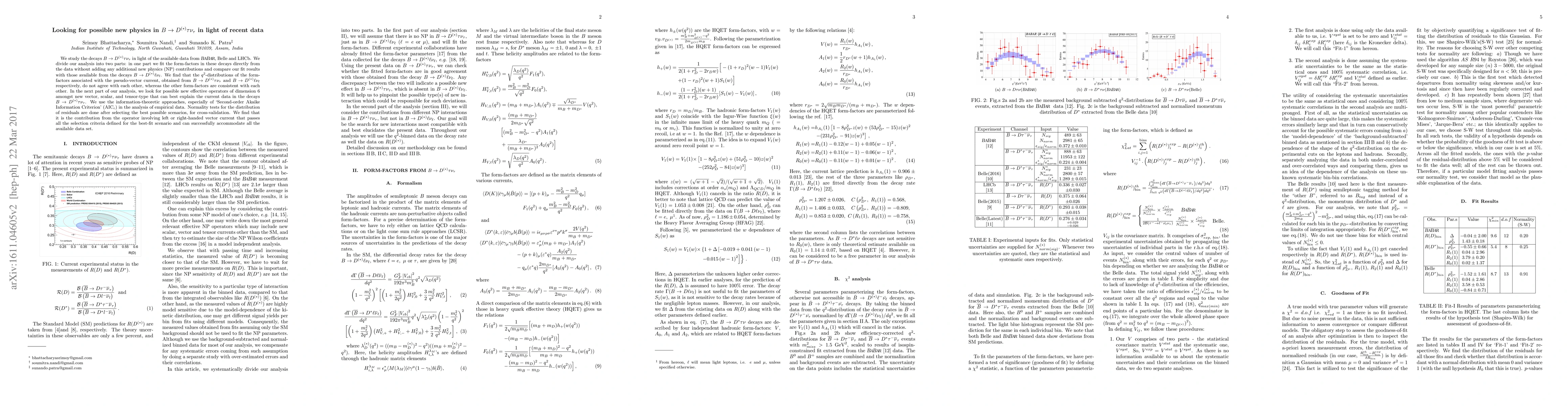 We study the decays $B\to D^{(\ast)}\tau\nu_{\tau}$ in light of the available data from BABAR, Belle and LHCb. We divide our analysis into two parts: in one part we fit the form-factors in these decays directly from the data without adding any additional new physics (NP) contributions and compare our fit results with those available from the decays $B\to D^{(\ast)}\ell\nu_{\ell}$. We find that the $q^2$-distributions of the form-factors associated with the pseudo-vector current, obtained from $B\to D^{(\ast)}\tau\nu_{\tau}$ and $B\to D^{(\ast)}\ell\nu_{\ell}$ respectively, do not agree with each other, whereas the other form-factors are consistent with each other. In the next part of our analysis, we look for possible new effective operators of dimension 6 amongst new vector, scalar, and tensor-type that can best explain the current data in the decays $B\to D^{(\ast)}\tau\nu_{\tau}$. We use the information-theoretic approaches, especially of `Second-order Akaike Information Criterion' (AIC$_c$) in the analysis of empirical data. Normality tests for the distribution of residuals are done after selecting the best possible scenarios, for cross-validation. We find that it is the contribution from the operator involving left or right-handed vector current that passes all the selection criteria defined for the best-fit scenario and can successfully accommodate all the available data set.