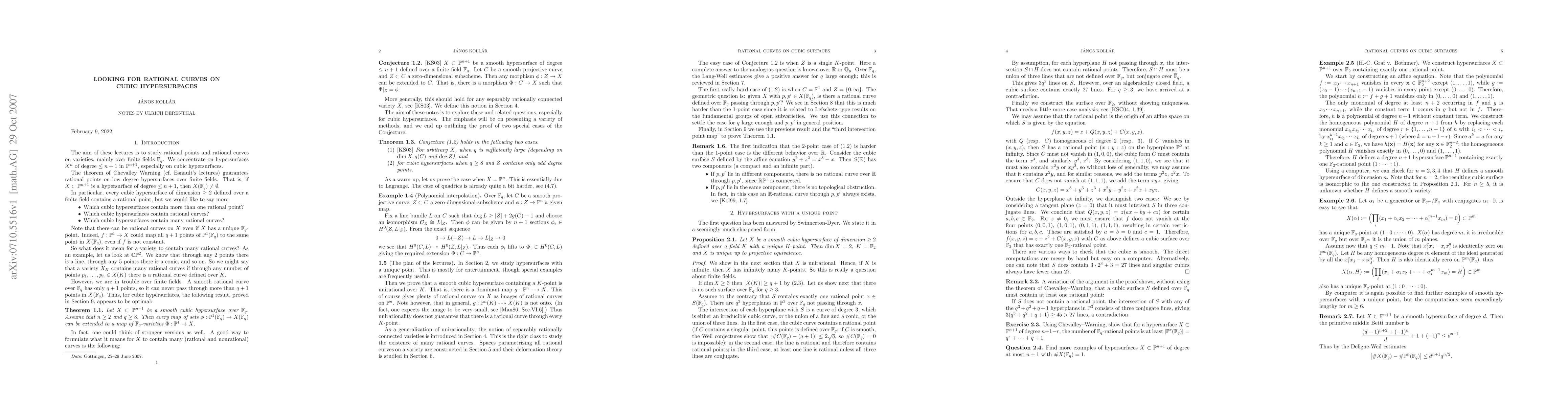 Summary: This paper provides an expanded lecture series on methods for finding rational curves on cubic hypersurfaces, with a focus on finite fields. The key contribution is the construction of rational curves through specified points on smooth cubic hypersurfaces over finite fields.