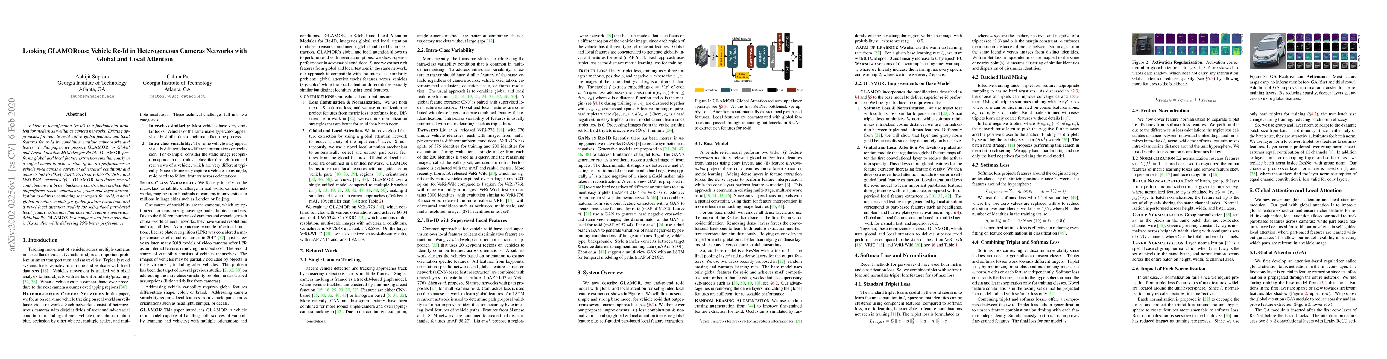 Vehicle re-identification (re-id) is a fundamental problem for modern surveillance camera networks. Existing approaches for vehicle re-id utilize global features and local features for re-id by combining multiple subnetworks and losses. In this paper, we propose GLAMOR, or Global and Local Attention MOdules for Re-id. GLAMOR performs global and local feature extraction simultaneously in a unified model to achieve state-of-the-art performance in vehicle re-id across a variety of adversarial conditions and datasets (mAPs 80.34, 76.48, 77.15 on VeRi-776, VRIC, and VeRi-Wild, respectively). GLAMOR introduces several contributions: a better backbone construction method that outperforms recent approaches, group and layer normalization to address conflicting loss targets for re-id, a novel global attention module for global feature extraction, and a novel local attention module for self-guided part-based local feature extraction that does not require supervision. Additionally, GLAMOR is a compact and fast model that is 10x smaller while delivering 25% better performance.