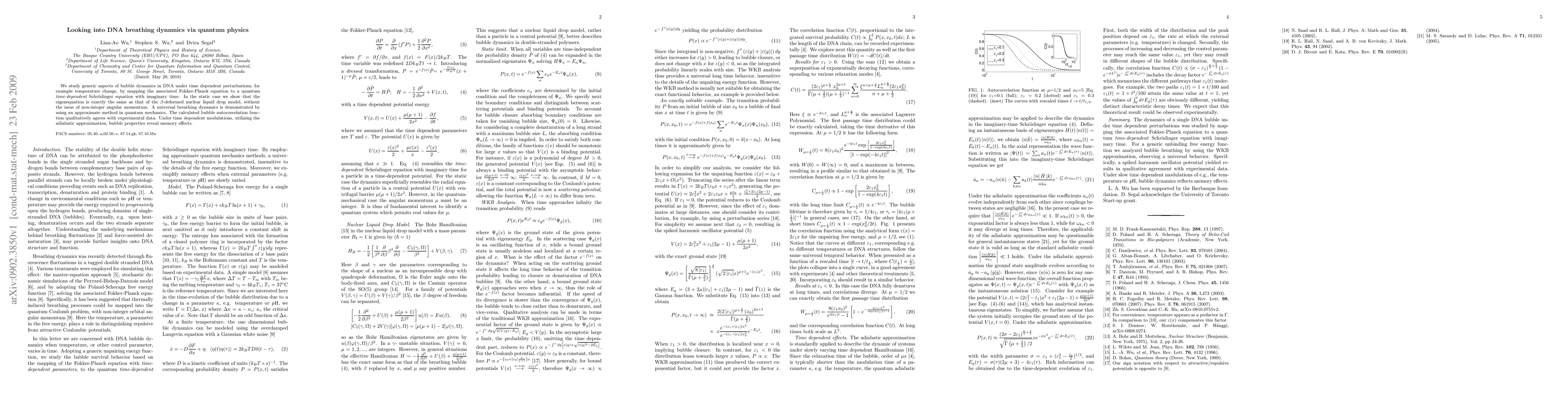 We study generic aspects of bubble dynamics in DNA under time dependent perturbations, for example temperature change, by mapping the associated Fokker-Planck equation to a quantum time-dependent Schroedinger equation with imaginary time. In the static case we show that the eigenequation is exactly the same as that of the $\beta$-deformed nuclear liquid drop model, without the issue of non-integer angular momentum. A universal breathing dynamics is demonstrated by using an approximate method in quantum mechanics. The calculated bubble autocorrelation function qualitatively agrees with experimental data. Under time dependent modulations, utilizing the adiabatic approximation, bubble properties reveal memory effects.
