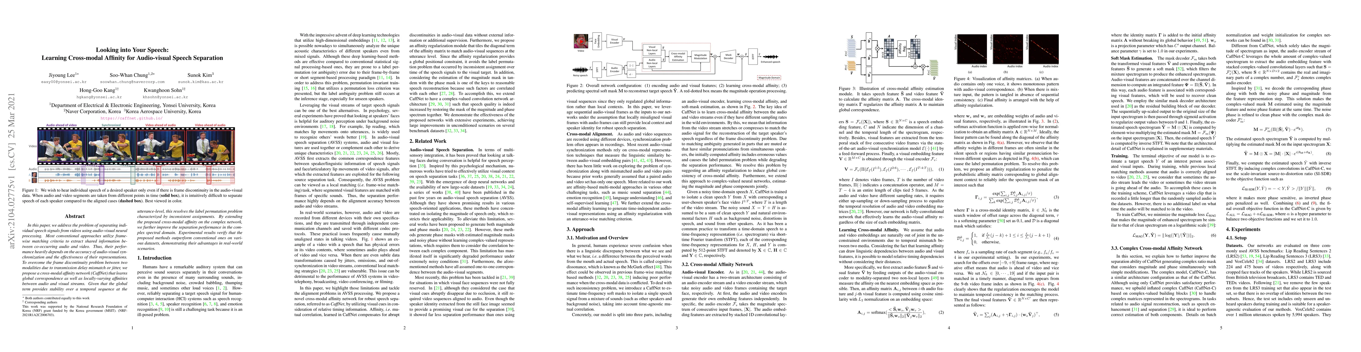 This paper proposes CaffNet, a cross-modal affinity network for audio-visual speech separation, which learns global and locally-varying affinities between audio and visual streams to resolve synchronization issues. The approach outperforms conventional methods on various datasets.