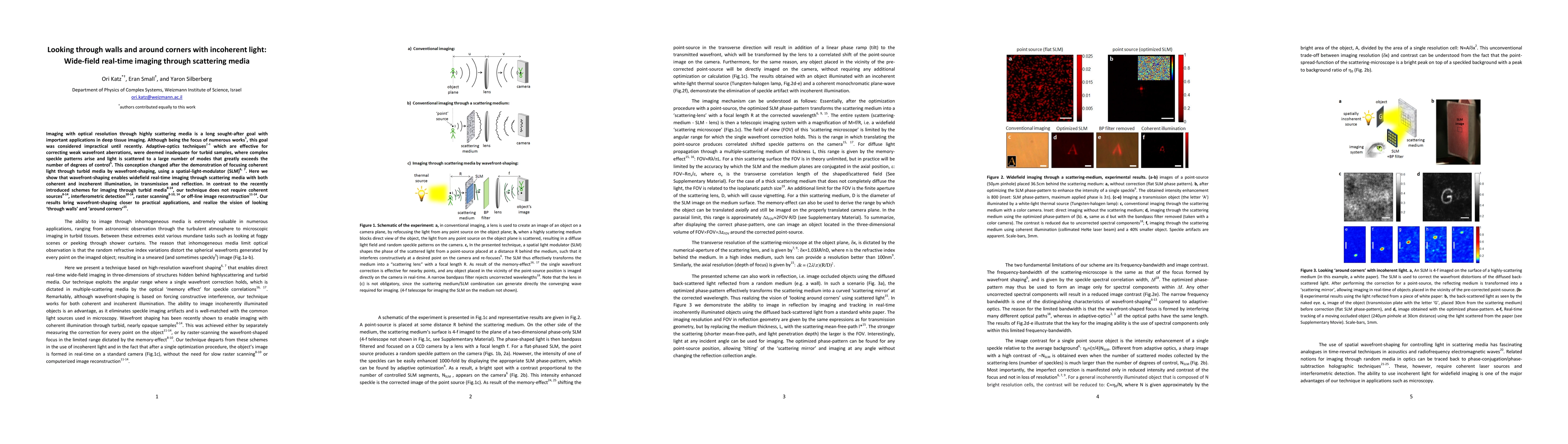 This paper demonstrates a wavefront-shaping technique for widefield real-time imaging through highly scattering media using incoherent light, eliminating the need for coherent sources or raster scanning, thus advancing practical applications in deep tissue imaging.