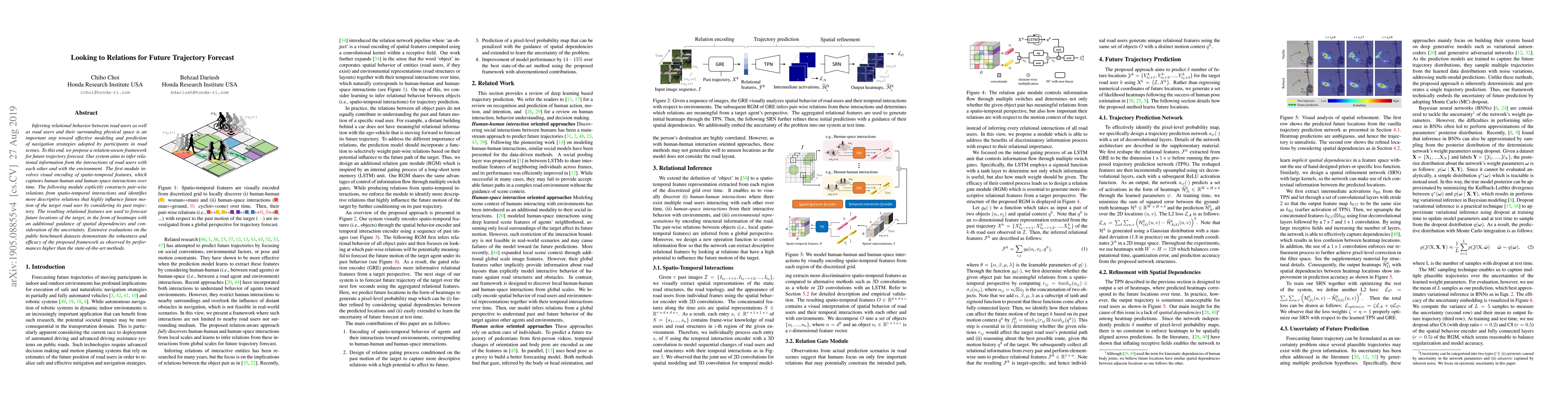 Inferring relational behavior between road users as well as road users and their surrounding physical space is an important step toward effective modeling and prediction of navigation strategies adopted by participants in road scenes. To this end, we propose a relation-aware framework for future trajectory forecast. Our system aims to infer relational information from the interactions of road users with each other and with the environment. The first module involves visual encoding of spatio-temporal features, which captures human-human and human-space interactions over time. The following module explicitly constructs pair-wise relations from spatio-temporal interactions and identifies more descriptive relations that highly influence future motion of the target road user by considering its past trajectory. The resulting relational features are used to forecast future locations of the target, in the form of heatmaps with an additional guidance of spatial dependencies and consideration of the uncertainty. Extensive evaluations on the public benchmark datasets demonstrate the robustness and efficacy of the proposed framework as observed by performances higher than the state-of-the-art methods.