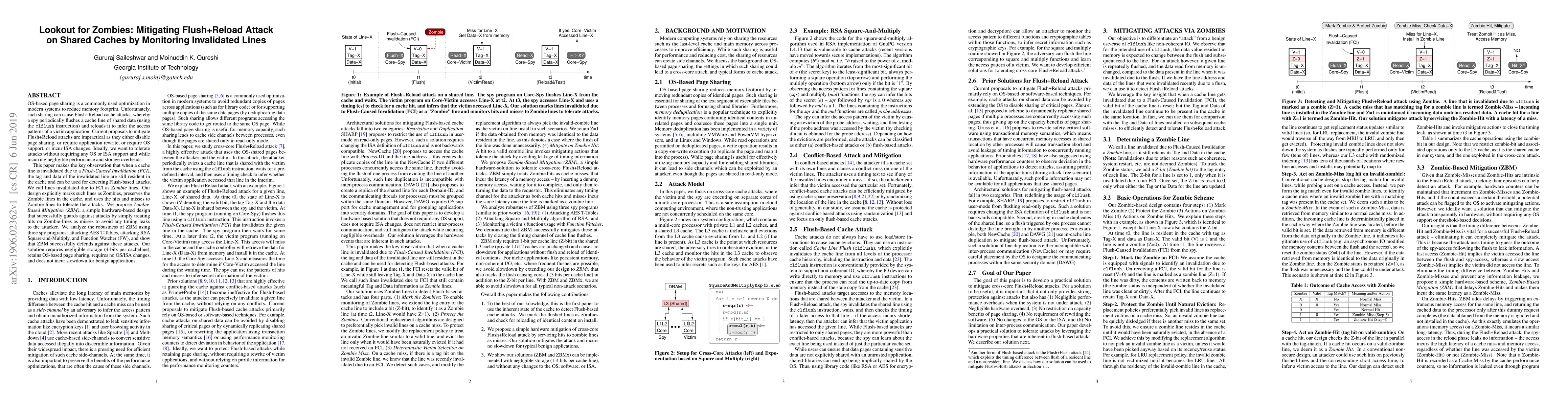 OS-based page sharing is a commonly used optimization in modern systems to reduce memory footprint. Unfortunately, such sharing can cause Flush+Reload cache attacks, whereby a spy periodically flushes a cache line of shared data (using the clflush instruction) and reloads it to infer the access patterns of a victim application. Current proposals to mitigate Flush+Reload attacks are impractical as they either disable page sharing, or require application rewrite, or require OS support, or incur ISA changes. Ideally, we want to tolerate attacks without requiring any OS or ISA support and while incurring negligible performance and storage overheads. This paper makes the key observation that when a cache line is invalidated due to a Flush-Caused Invalidation (FCI), the tag and data of the invalidated line are still resident in the cache and can be used for detecting Flush-based attacks. We call lines invalidated due to FCI as Zombie lines. Our design explicitly marks such lines as Zombies, preserves the Zombie lines in the cache, and uses the hits and misses to Zombie lines to tolerate the attacks. We propose Zombie-Based Mitigation (ZBM), a simple hardware-based design that successfully guards against attacks by simply treating hits on Zombie-lines as misses to avoid any timing leaks to the attacker. We analyze the robustness of ZBM using three spy programs: attacking AES T-Tables, attacking RSA Square-and-Multiply, and Function Watcher (FW), and show that ZBM successfully defends against these attacks. Our solution requires negligible storage (4-bits per cache line), retains OS-based page sharing, requires no OS/ISA changes, and does not incur slowdown for benign applications.
