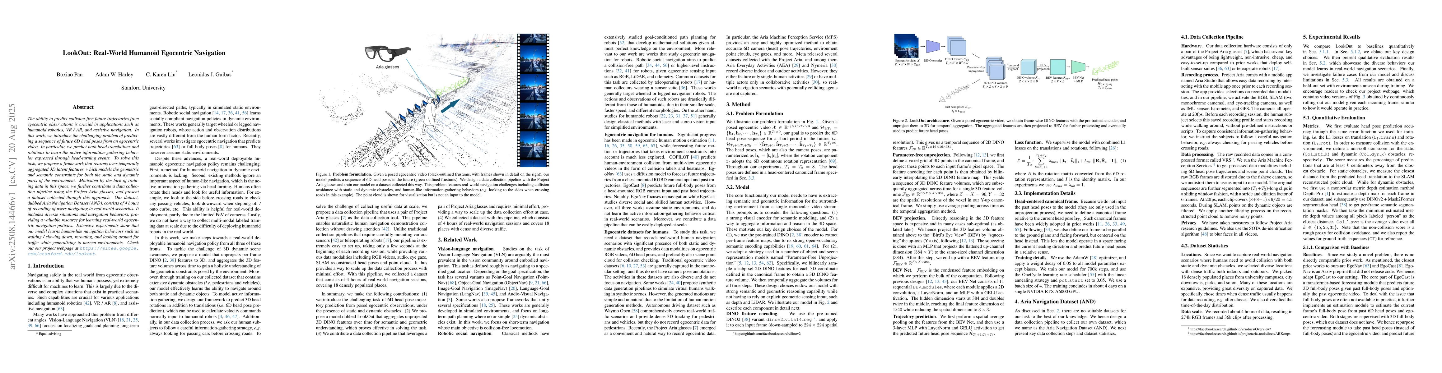 The ability to predict collision-free future trajectories from egocentric observations is crucial in applications such as humanoid robotics, VR / AR, and assistive navigation. In this work, we introduce the challenging problem of predicting a sequence of future 6D head poses from an egocentric video. In particular, we predict both head translations and rotations to learn the active information-gathering behavior expressed through head-turning events. To solve this task, we propose a framework that reasons over temporally aggregated 3D latent features, which models the geometric and semantic constraints for both the static and dynamic parts of the environment. Motivated by the lack of training data in this space, we further contribute a data collection pipeline using the Project Aria glasses, and present a dataset collected through this approach. Our dataset, dubbed Aria Navigation Dataset (AND), consists of 4 hours of recording of users navigating in real-world scenarios. It includes diverse situations and navigation behaviors, providing a valuable resource for learning real-world egocentric navigation policies. Extensive experiments show that our model learns human-like navigation behaviors such as waiting / slowing down, rerouting, and looking around for traffic while generalizing to unseen environments. Check out our project webpage at https://sites.google.com/stanford.edu/lookout.