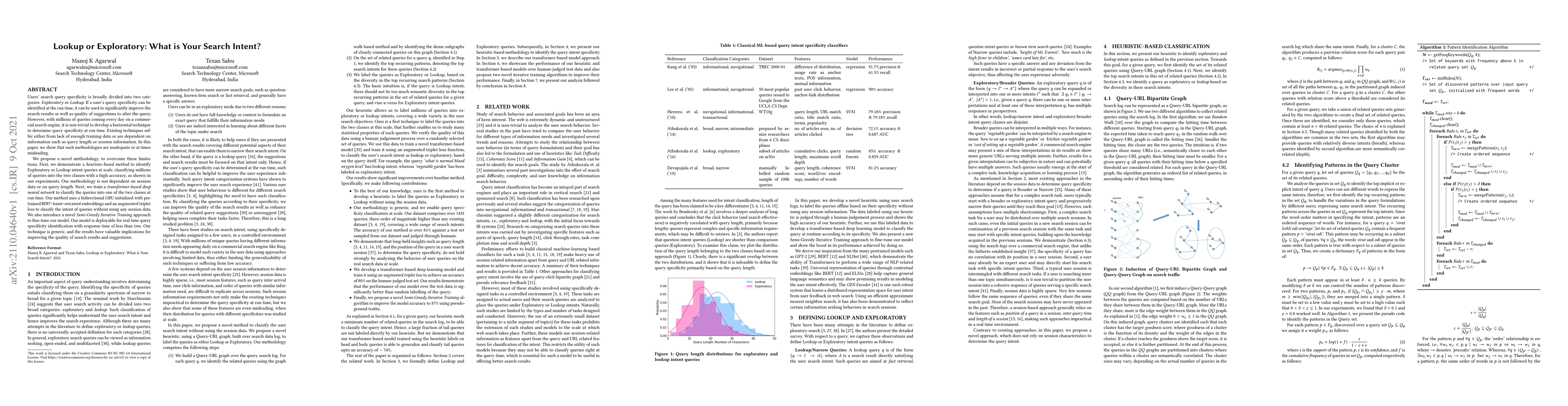 Search query specificity is broadly divided into two categories - Exploratory or Lookup. If a query specificity can be identified at the run time, it can be used to significantly improve the search results as well as quality of suggestions to alter the query. However, with millions of queries coming every day on a commercial search engine, it is non-trivial to develop a horizontal technique to determine query specificity at run time. Existing techniques suffer either from lack of enough training data or are dependent on information such as query length or session information. In this paper, we show that such methodologies are inadequate or at times misleading. We propose a novel methodology, to overcome these limitations. First, we demonstrate a heuristic-based method to identify Exploratory or Lookup intent queries at scale, classifying millions of queries into the two classes with a high accuracy, as shown in our experiments. Our methodology is not dependent on session data or on query length. Next, we train a transformer-based deep neural network to classify the queries into one of the two classes at run time. Our method uses a bidirectional GRU initialized with pretrained BERT-base-uncased embeddings and an augmented triplet loss to classify the intent of queries without using any session data. We also introduce a novel Semi-Greedy Iterative Training approach to fine-tune our model. Our model is deployable for real time query specificity identification with response time of less than one millisecond. Our technique is generic, and the results have valuable implications for improving the quality of search results and suggestions.