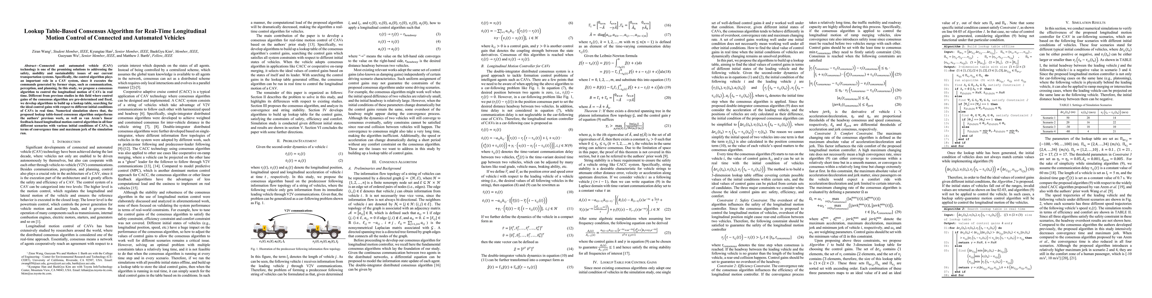 This paper proposes a lookup table-based consensus algorithm for real-time longitudinal motion control of connected and automated vehicles (CAVs). Unlike previous methods, the algorithm dynamically determines optimal control gains in real time, outperforming previous algorithms in terms of convergence time and maximum jerk across various scenarios.