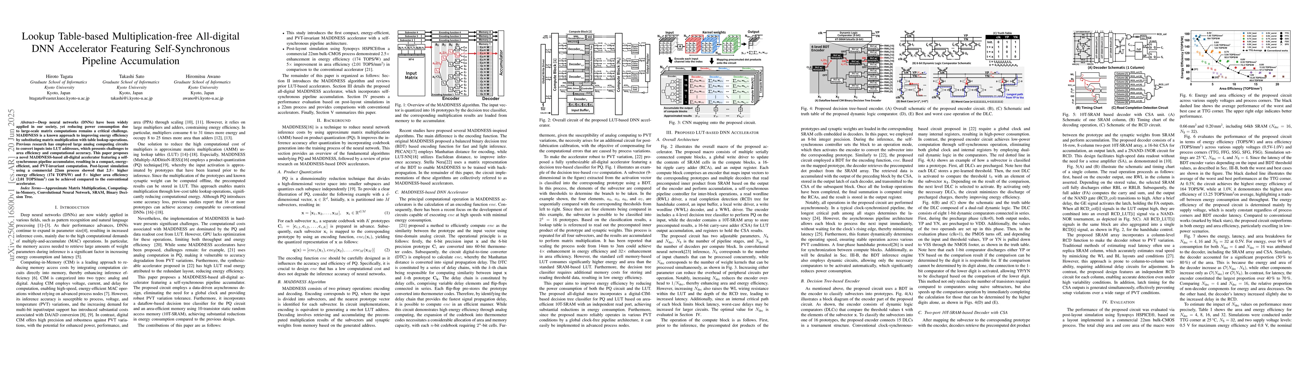 Deep neural networks (DNNs) have been widely applied in our society, yet reducing power consumption due to large-scale matrix computations remains a critical challenge. MADDNESS is a known approach to improving energy efficiency by substituting matrix multiplication with table lookup operations. Previous research has employed large analog computing circuits to convert inputs into LUT addresses, which presents challenges to area efficiency and computational accuracy. This paper proposes a novel MADDNESS-based all-digital accelerator featuring a self-synchronous pipeline accumulator, resulting in a compact, energy-efficient, and PVT-invariant computation. Post-layout simulation using a commercial 22nm process showed that 2.5 times higher energy efficiency (174 TOPS/W) and 5 times higher area efficiency (2.01 TOPS/mm2) can be achieved compared to the conventional accelerator.