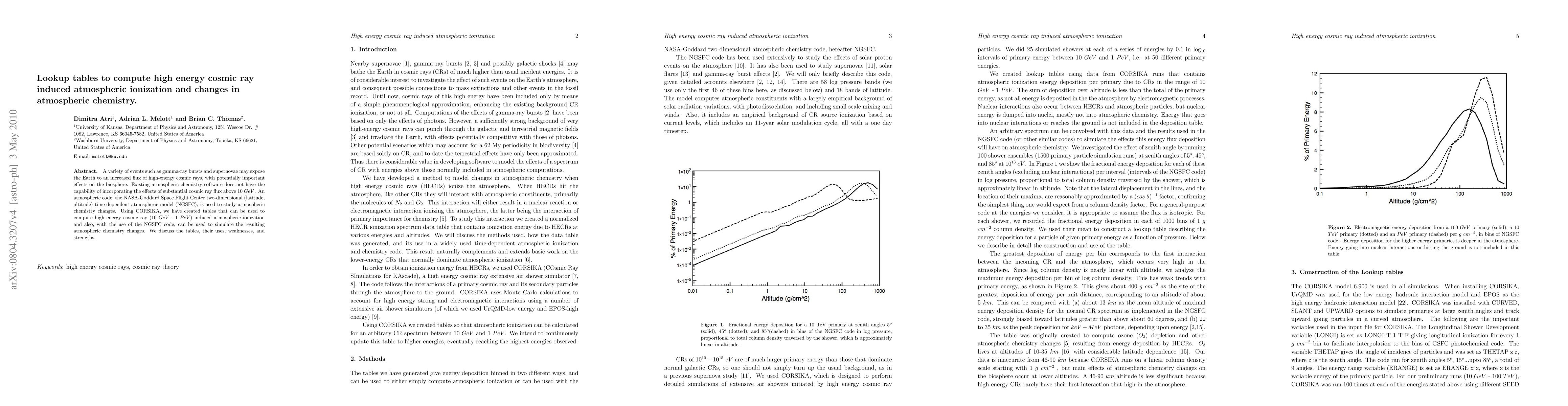 This paper develops lookup tables to compute high-energy cosmic ray-induced atmospheric ionization and simulates the resulting atmospheric chemistry changes using the NGSFC model. The tables, created with CORSIKA, address the limitations of existing atmospheric chemistry software in handling cosmic ray fluxes above 10 GeV.