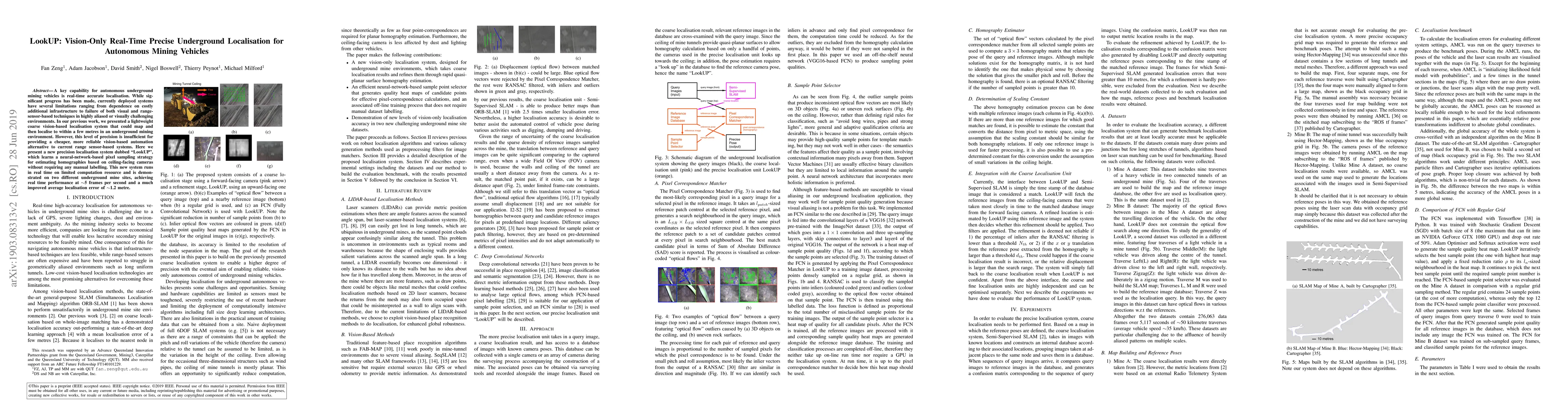 A key capability for autonomous underground mining vehicles is real-time accurate localisation. While significant progress has been made, currently deployed systems have several limitations ranging from dependence on costly additional infrastructure to failure of both visual and range sensor-based techniques in highly aliased or visually challenging environments. In our previous work, we presented a lightweight coarse vision-based localisation system that could map and then localise to within a few metres in an underground mining environment. However, this level of precision is insufficient for providing a cheaper, more reliable vision-based automation alternative to current range sensor-based systems. Here we present a new precision localisation system dubbed "LookUP", which learns a neural-network-based pixel sampling strategy for estimating homographies based on ceiling-facing cameras without requiring any manual labelling. This new system runs in real time on limited computation resource and is demonstrated on two different underground mine sites, achieving real time performance at ~5 frames per second and a much improved average localisation error of ~1.2 metre.