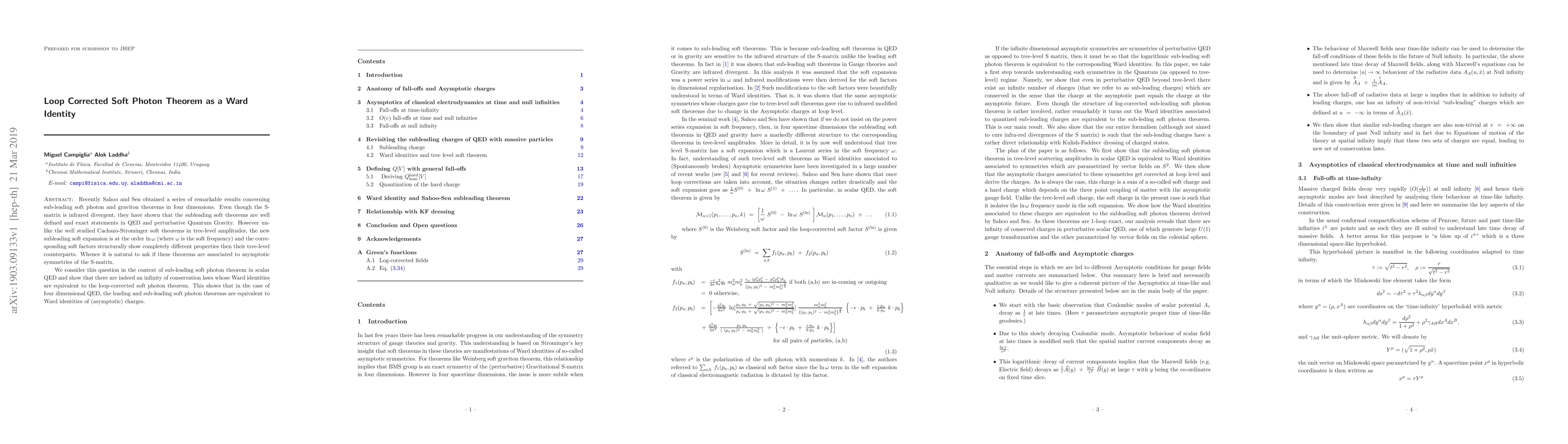 Recently Sahoo and Sen obtained a series of remarkable results concerning sub-leading soft photon and graviton theorems in four dimensions. Even though the S- matrix is infrared divergent, they have shown that the sub-leading soft theorems are well defined and exact statements in QED and perturbative Quantum Gravity. However unlike the well studied Cachazo-Strominger soft theorems in tree-level amplitudes, the new sub-leading soft expansion is at the order ln {\omega} (where {\omega} is the soft frequency) and the corresponding soft factors structurally show completely different properties then their tree-level counterparts. Whence it is natural to ask if these theorems are associated to asymptotic symmetries of the S-matrix. We consider this question in the context of sub-leading soft photon theorem in scalar QED and show that there are indeed an infinity of conservation laws whose Ward identities are equivalent to the loop-corrected soft photon theorem. This shows that in the case of four dimensional QED, the leading and sub-leading soft photon theorems are equivalent to Ward identities of (asymptotic) charges.