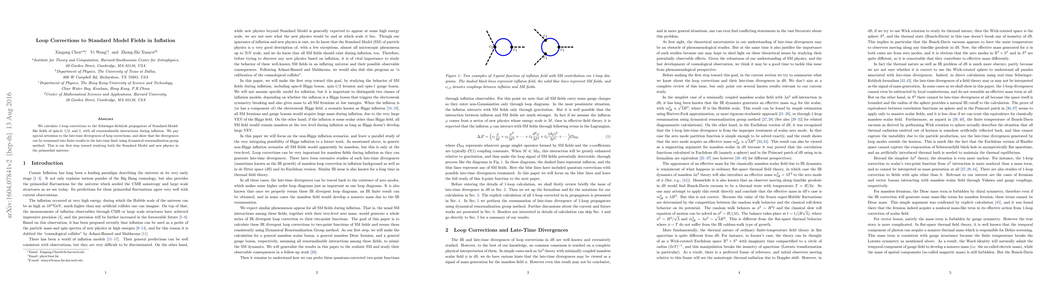 We calculate 1-loop corrections to the Schwinger-Keldysh propagators of Standard-Model-like fields of spin-0, 1/2, and 1, with all renormalizable interactions during inflation. We pay special attention to the late-time divergences of loop corrections, and show that the divergences can be resummed into finite results in the late-time limit using dynamical renormalization group method. This is our first step toward studying both the standard model and new physics in the primordial universe.