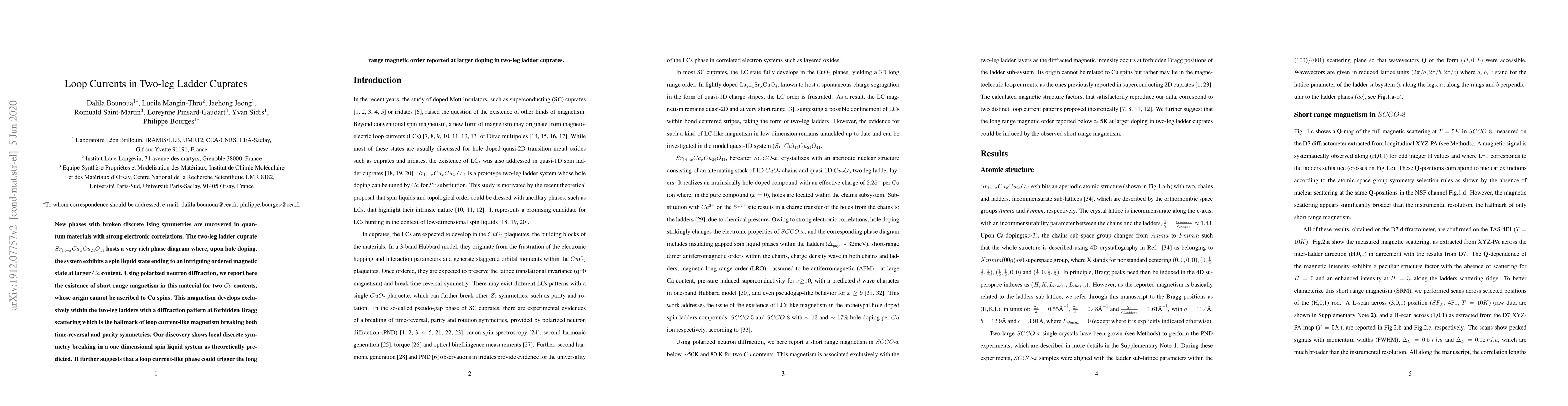 New phases with broken discrete Ising symmetries are uncovered in quantum materials with strong electronic correlations. The two-leg ladder cuprate \textbf{$Sr_{14-x}Ca_{x}Cu_{24}O_{41}$} hosts a very rich phase diagram where, upon hole doping, the system exhibits a spin liquid state ending to an intriguing ordered magnetic state at larger $Ca$ content. Using polarized neutron diffraction, we report here the existence of short range magnetism in this material for two $Ca$ contents, whose origin cannot be ascribed to Cu spins. This magnetism develops exclusively within the two-leg ladders with a diffraction pattern at forbidden Bragg scattering which is the hallmark of loop current-like magnetism breaking both time-reversal and parity symmetries. Our discovery shows local discrete symmetry breaking in a one dimensional spin liquid system as theoretically predicted. It further suggests that a loop current-like phase could trigger the long range magnetic order reported at larger doping in two-leg ladder cuprates.